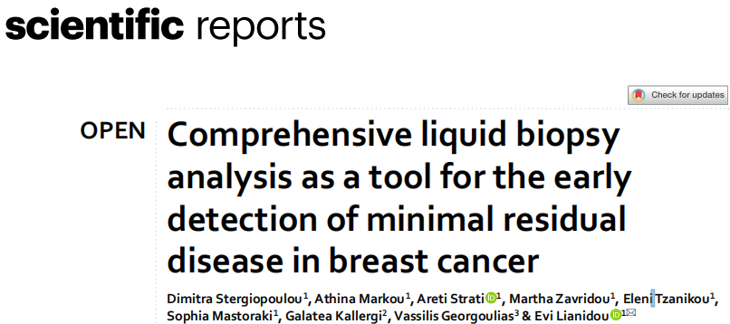 近日,一组来自希腊的研究团队在杂志Scientific reports上发表了一篇题为“Comprehensive liquid biopsy analysis as a tool for the early detection of minimal residual disease in breast cancer”的文章。在这项研究中,研究团队首次基于长期随访,对13名确诊为早期乳腺癌症的患者进行了全面的液体活检分析。分析基于CTC计数、CTC表型特征和CTC在基因表达、DNA突变和DNA甲基化水平的分子监测,以及相应的cfDNA突变和甲基化水平。结果表明,全面的液体活检分析为癌症患者的治疗管理提供了有价值和重要的信息,可以在出现临床可检测的转移性疾病和疾病进展之前几年揭示MRD的存在。