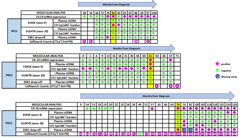 DNA突变:转移的临床表现前一年,PIK3CA热点突变和ESR1突变在来自CellSearch的CTC来源DNA中,和在血浆cfDNA和EpCAM(+)CTC组分中连续检测到。在同一时间段,ESR1甲基化在血浆cfDNA和相应的EpCAM(+)CTC组分中检测到。这些结果表明,虽然CTC计数的增加表明转移扩散很早,但DNA水平上的CTC分子特征清楚地表明肿瘤已经对治疗产生了耐药性。