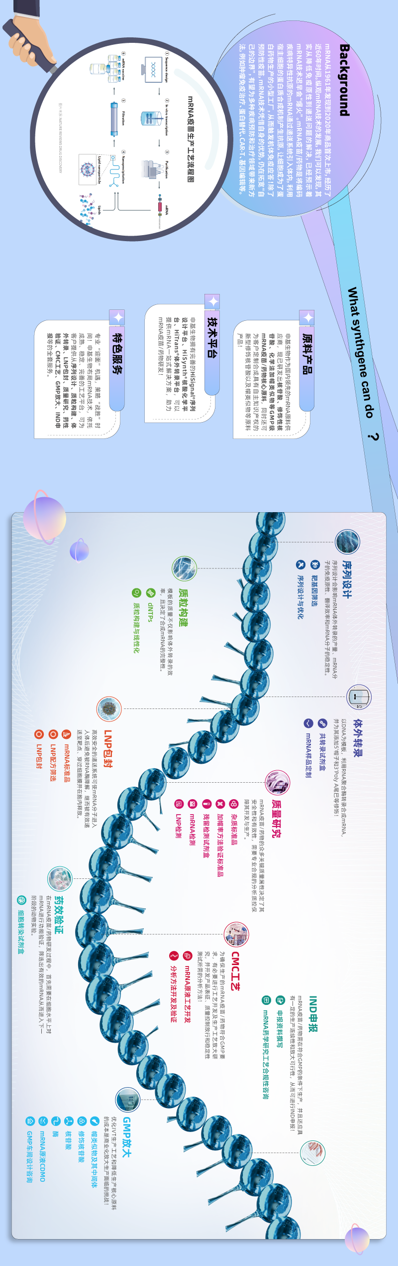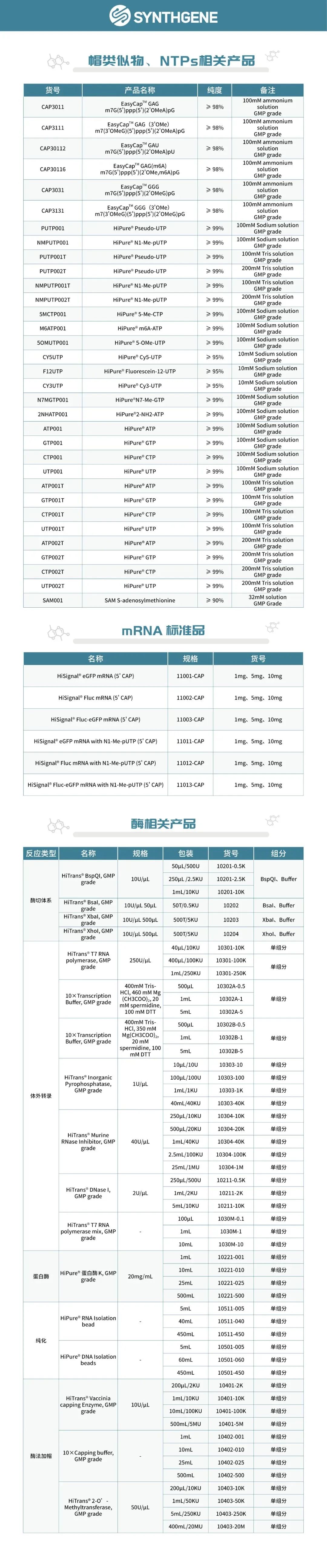 SYNTHGENE 申基生物 好书分享 《The story of mRNA》 看!The story of mRNA 看!The story of mRNA 看! 申基生物 国内领先的mRNA原料供应商 横屏观看效果更佳呦! 看了才知道吼! 藏在书中的精彩 申基可提供mRNA体外合成所需要的NTPs、特殊修饰的NTPs以及帽类似物,分子诊断与二代测序所需要的脱氧核苷酸原料dNTPs,siRNA以及ASO合成所需要的亚磷酰胺单体等。 产品订购热线 订购热线:400-885-0615 左经理:13203768289(微信同步) 李经理:15895957925(微信同步) SYNTHGENE 申基生物成立于2018年,专注于为客户提供生命科学领域上游原料的整体解决方案。公司核心成员源自南京大学化学生物学博士团队,首席科学家为陈洪渊院士,拥有极强的化学生物学技术背景,多年来致力于生命科学卡脖子原料的研发和产业化,现已具有抗体发现平台、mRNA原液制备平台、mRNA-LNP制剂工艺平台、寡核苷酸制备平台、酶定向进化平台等技术,在此驱动下,衍生细胞基因治疗原料、基因核酸药物原料以及IVD原料三大产品板块。公司已入选南京市培育独角兽企业,已获多轮数亿元融资。 |