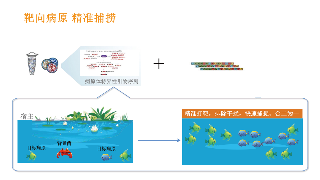 如何才能够聚焦核心病原?金域医学通过近十万例mNGS检测大数据,百万例非mNGS检测大数据的分析发现:不同标本类型病原谱不同,其核心病原以50-100种为主。依托这些大数据,金域医学tNGS系列产品的研发初衷就是帮助临床快速建立评估病原体及耐药性的能力。2021年,金域医学联合金圻睿自主开发出靶向测序技术(tNGS)平台。该平台将“PCR”和“NGS”的优势相结合,同时有效排除人体定植微生物对结果的干扰,更有利于临床快速锁定目标病原。如果将其比喻为捕鱼,可以理解为通过多重PCR平台制作目标鱼儿的饵料投入水中,让目标鱼儿感兴趣并食用,并且可将不同鱼儿进行分类,实现精准捕捞,排除其他干扰的鱼类。这是行业首个在感染性疾病领域应用的tNGS技术,采用超多重PCR正向富集目标病原,提升检测灵敏度,同时可以排除宿主核酸干扰,实现DNA和RNA共检,具有检测范围广、鉴定准、性价比高、可定制化、可精准分型的特点。