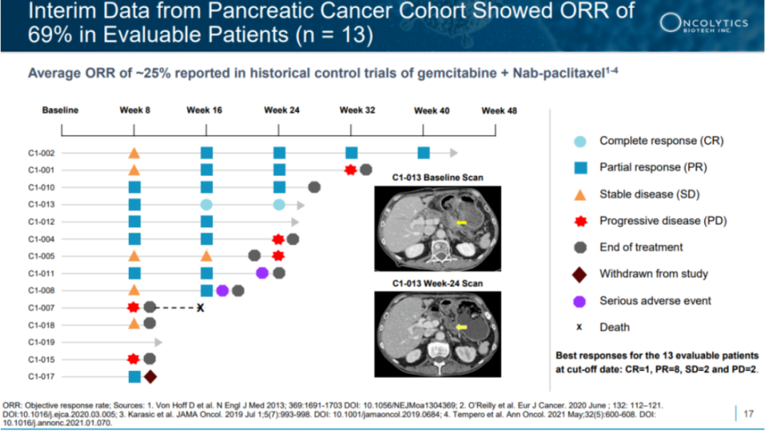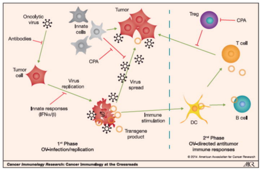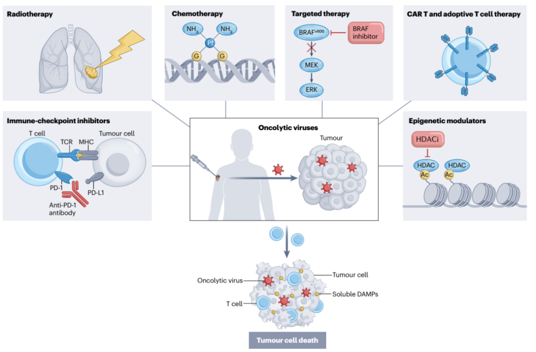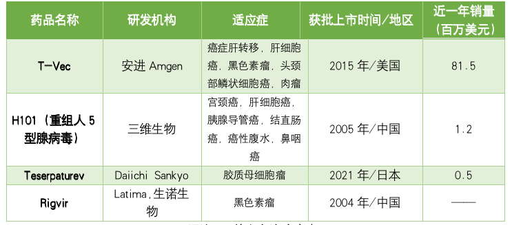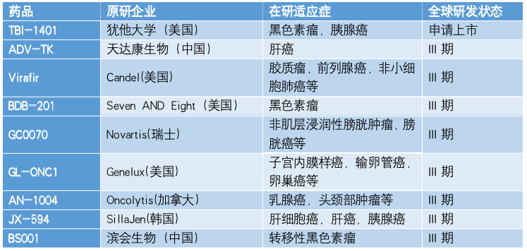 图注:靶点分布图(数据来源:智慧芽) 除上市药物以外,全球范围内处在III期临床及以上的药物共有9种。 溶瘤病毒的本质是一种具有复制能力的病毒,它可以在感染并裂解肿瘤细胞,诱导肿瘤细胞免疫原性死亡,改变肿瘤微环境的同时,不影响正常细胞。而现今的研究往往会通过基因修饰的方法克服天然病毒安全性问题、提高肿瘤选择性、改善病毒复制能力、限制病原性并且提高免疫原性。理论上,DNA病毒和RNA病毒都可成为候选病毒,但大部分的研究都还是会选择DNA病毒。 如前文所说,T-VEC是FDA批准的首个溶瘤病毒疗法,也是唯一受到广泛认可的溶瘤病毒产品。T-VEC由安进公司研发,是一种基于改良的1型单纯疱疹病毒(HSV-1)的溶瘤病毒疗法。该药物2011年获得FDA孤儿药资格,2015年10月27日经FDA批准用于不可切除的转移性黑色素瘤的治疗。 除遵循基本原理外,该药物内部包含可刺激免疫系统的GM-CSF编码序列,当注入相应位置肿瘤后,可以在肿瘤细胞中复制并裂解肿瘤细胞,使肿瘤细胞释放肿瘤相关抗原和GM-CSF蛋白,激发和加速抗肿瘤免疫应答。 3.1 安全性与剂量摸索试验①T-VEC的人体首次临床试验: 30名身患乳腺癌、头颈癌、黑色素瘤和结肠癌并且经标准治疗后疾病仍然进展的病人参与了该项研究。接受治疗的大部分病人只表现头晕、发热、恶心、寒颤、注射处疼痛的1-2级副反应,因此该药物的安全性得到了证实。 ②有效给药剂量如下:初始时,注射一剂106PFU/ml;三周后,每两周注射一剂108PFU/ml。不但如此,该试验还建立了以肿瘤体积为标准的药物体积滴定方法,该方法保证了注射药物的充分并且不会因为过量而从注射位点漏出,因此该方法在后续的临床研究中沿用。 3.2 黑色素瘤Ⅲ期临床显著获益在一项用于评估 OncoVEX^GM-CSF 与皮下给药 GM-CSF 治疗不可切除的 IIIb、IIIc 和 IV 期黑色素瘤患者的疗效和安全性的随机III期临床试验中,436名患者分为两组,分别在24周内进行28天为一周期的治疗,T-VEC组相对于GM-CSF组的疗效显著提高,DRR(16.3% vs 2.1%),ORR(26.4% vs 5.7%)。而T-VEC获批用于黑色素瘤就是基于这项试验所得到的积极结果。 3.3 令人振奋!三阴性乳腺癌(TNBC)或许从中获益!除黑色素瘤之外,研究人员正积极拓宽T-VEC的适应症。2月9日发布的一篇文章就带来了令人振奋的消息:T-VEC在TNBC的治疗上取得积极结果。在该项II期试验中,37名患者在手术前接受T-VEC联合新辅助化疗,其中45.9%(17/37)的患者治疗后获得完全缓解,要知道的是,这项数据在标准化疗的病人身上只有15%到30%。不仅如此,治疗后两年,89%的患者没有复发,与之产生强烈对比的是,只有60%的接受新辅助疗法的患者可以有两年的无病生存,且安全性与单用标准化疗没有显著差异性。 时下,TNBC的标准疗法为Keytruda与化疗的组合疗法,接受该疗法的三年无复发率约为84%,T-VEC标准化疗组合疗法竟也可以媲美,并且因两种疗法抗肿瘤免疫机制的迥异,且溶瘤病毒的肿瘤高度选择性,两种疗法的联合可能会为疗效和安全性增益。该文章通讯作者,莫菲特癌症中心乳腺癌医学专家Soliman博士表示:“我们的研究结果表明,当将T-VEC添加到全身化疗中时,可能会增加高风险、早期三阴性乳腺癌的反应。有证据表明肿瘤内有强大的免疫激活,因而有必要对T-VEC与目前的化学免疫疗法相结合对三阴性乳腺癌进行进一步研究。” 虽然这项试验展现了溶瘤病毒疗法在TNBC治疗上的潜力,然而值得注意的是,这是一项没有对照组的单臂试验,因此试验结果仍需通过大型的随机试验进行进一步的验证。 3.4 T-VEC联合治疗走向肿瘤治疗新高度Ovs的抗肿瘤机制与其他治疗方法迥异,且毒性作用有限,因此Ovs与其他治疗方法的有机联合成为未来溶瘤病毒研究与应用的一大方向。研究表明,溶瘤病毒可以作用于肿瘤微环境,促进PD-1和PD-L1的表达,逆转ICIs的耐药性。两药协同作用也在多种动物模型中得到证实。 在一项随即临床II期试验中,198名难治性黑色素瘤患者分别接受T-VEC+伊匹单抗或者伊匹单抗单药治疗。结果表明,联合治疗组相对于单药治疗组疗效明显提高,ORR(39% vs 18%)。联合用药相比于单药治疗的毒性也没有明显增加。 除此之外,T-VEC与放疗、化疗、靶向疗法、过继细胞疗法的联用也正处在如火如的阿研究当中,早期的一些积极结果也鼓舞了研发人员的士气,为溶瘤病毒未来的发展方向提供了巨大的可能性。 CG0070的研发是基于一种改造的5型腺病毒(Ad5)骨架,它包含一个肿瘤特异性启动子(E2F-1)和一个GM-CSF基因。目前该药物临床进展最快的领域为非浸润性膀胱肿瘤,其在美国、澳大利亚、日本、韩国、中国台湾均处在临床III期试验,而在中国大陆处在临床I期阶段。 该药物的出现可以很大程度上满足泌尿系统肿瘤的医疗需求。原研企业CG oncology也在2022年公布了一项CG0070 与 Pembrolizumab 联合用于对卡介苗 (BCG) 无反应的非肌肉浸润性膀胱癌 (NMIBC) 患者的 2 期单臂研究的中期结果(NCT04387461)。CG表示,在三个月的随访中,88%(28/32)的患者没有癌症进展迹象,一年内,86%(18/21)的患者对治疗有完全反应,且不良反应与单药使用相一致。CG更是因为这一结果获利,成功获得1.2亿美元融资,超过了其成立12年以来的融资总和。而现阶段进行的III期试验旨在评估膀胱内 (IVE) 给予 CG0070 对患有组织病理学证实的NMIBC患者的活性(这些患者患有芽孢杆菌 - 卡介苗 (BCG) 无反应性疾病,无论是原位
