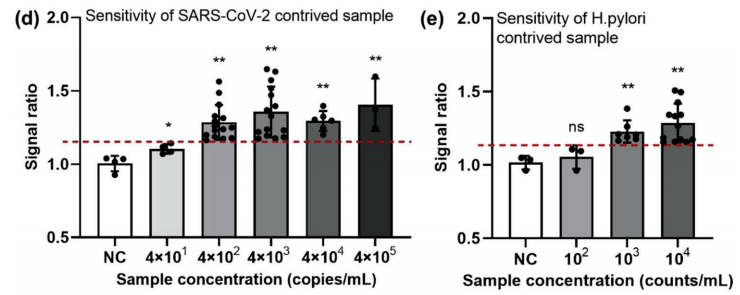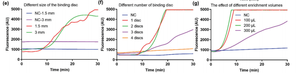 传染病大流行对全球医疗系统构成了巨大挑战。快速准确的诊断测试是有效防止病毒传播的关键。此外,致癌感染是一种重要的、潜在可预防的致癌因素。感染引发的癌症占全球所有癌症病例的1/6以上,对低资源环境中的人们造成了不成比例的影响。 尽管实验室中的精密诊断仪器可以提供高度灵敏、选择性和可重复的检测,但它们通常只在大城市的医院提供,而在许多缺乏必要基础设施的发展中国家无法使用。POCT是实验室测试的简化版本,近年来作为一种测试趋势迅速发展。该技术旨在在患者的护理场所或附近进行诊断分析,消除了对复杂实验室样本处理的需要,并快速获得测试结果。因此,它们可以被送到各种初级卫生服务设施和低资源地区,以扩大人口覆盖范围。核酸检测能够以高灵敏度和特异性检测微生物的核酸,在诊断各种病原体中发挥着重要作用。常规聚合酶链式反应(PCR)需要复杂的温度控制,不适合现场测试。等温核酸扩增,如RPA和环介导等温扩增(LAMP),是POCT分子诊断的有力方法,因为它们只需要恒温加热器,如水浴或加热块,而不需要热循环仪。RPA反应接近常温(37–42°C),快速高效,通常只需20分钟即可产生肉眼可分辨的结果。它有可能在POCT开发中实现便携式、高灵敏度以及多路检测。 已经开发了用于资源有限环境的各种核酸检测。例如,Jonathan Cooper小组开发了一种基于纸张的POCT设备,用于在40分钟内通过逆转录酶LAMP(RT-LAMP)进行病原体检测。然而,诸如非整合核酸提取、开放检测系统增加交叉污染风险、对昂贵设备(即移液管、商用加热器、离心机、LED透照器等)和基础设施(即交流电源)的依赖性等问题严重限制了POCT的应用,尤其是现场测试。 近日,一组来自中国的研究团队在杂志Advanced Science上发表了一篇题为“Portable Paper-Based Nucleic Acid Enrichment for Field Testing”的文章。在文章中,研究团队描述了一种简单的便携式快速感染病原体的检测平台,包括SARS-CoV-2和幽门螺旋杆菌。在一个典型的on-site测试设置中,样品到结果的周转时间短于30分钟。结果可以用肉眼读取,也可以通过智能手机应用程序进行分析。该平台是灵活的,可以在一次测试中检测多种病原体。该平台为任何地方的传染源检测提供了一种快速、准确和方便的方法。 图片来源:Advanced Science POCT平台的设计和运行 POCT平台的工作流中有四个主要步骤(如下图)。 (1) 样品收集和室温下裂解。 (2) 纸基核酸富集。将溶解的样品装入纸基富集芯片,并通过横向流动将核酸提取到结合盘(binding disc),然后用无水乙醇洗涤结合盘以快速除去残余水。 (3) RPA反应。将预安装管中的结合盘、引物、探针和RPA试剂加载到扩增芯片上,进行one-pot反应。芯片用粘土密封,并在40°C的电池供电便携式读取器中孵育20分钟。 (4) 结果读数。将芯片取出并放置在检测室中,并在488nm蓝光激发下观察。阳性对照显示亮绿色荧光,而阴性对照保持无色(或非常浅绿色荧光)。荧光结果可以直接从便携式读取器中可视化,并通过智能手机应用程序进一步分析。 POCT平台的工作流。图片来源:Advanced Science 核酸富集 研究团队设计了一种新型的基于纸张的核酸富集芯片,用于快速提取DNA/RNA。芯片上浓缩的核心是一个直径1.5 mm的纸装圆盘(图a)。将室温下使用裂解缓冲液裂解的100µL样品体积添加到样品装载区域,并通过毛细管作用穿过结合盘,核酸被捕获在结合盘上。干燥后的核酸结合盘,被直接用作RPA反应的扩增底物。在30分钟内,使用此纸基富集方法从核酸浓度低至100拷贝/毫升的样品中检测到荧光扩增信号。此纸基富集方法比普通FTA卡提取方法敏感100倍(图d)。一种可能的解释是,样品中更多的靶核酸被捕获在结合盘中,而扩增抑制剂通过侧向流被洗掉。 纸基的核酸富集方法。图片来源:Advanced Science 病原体的常温裂解 样品预处理的另一个关键问题是裂解。与纸基核酸富集相结合需要一种不加热的快速和室温裂解方法。研究团队在室温下测试了一些常见的裂解缓冲液(如Trizol、RIPA、NP-40和TritonX-100),以检测人造细菌或病毒样本。结果表明,Trizol和RIPA对人造病毒样品均表现良好,RIPA和NP-40对人造细菌样品均表现出色。 还通过实验验证了一个1.5毫米直径的结合盘足以进行核酸富集(图e,f)。此外还优化了用于富集的适当样品体积。结果显示,在1.5 mm结合盘上富集的100µL裂解样品的体积足以在8分钟的富集时间内获得满意的扩增(图g)。 纸基的样品预处理。图片来源:Advanced Science 便携式读取器的结构 研究团队设计并制造了一个可充电便携式读取器,用于恒温加热和终点荧光输出(图a,b)。便携式阅读器小巧轻便(15厘米×13厘米×7厘米,重量仅500克)。使用一对可充电锂电池,一次充电可使其运行8-9小时,并支持至少24批测试。实验室制造成本低于30美元,并且便携式读取器在每次使用后不需要更换或清洁。 恒温培养单元、视觉读出单元、温度控制器和双18650电池集成到电池供电的便携式读取器中。等温培养单元主要是两个加热垫,设置在加热室底部和盖子上,用于扩增芯片的加热。视觉读出单元是488nm蓝光和塑料发射滤光片。 POCT平台的结构。图片来源:Advanced Science one-pot检测 芯片上采用one-pot扩增,整个反应在密封系统中进行,无需打开盖子,可以有效避免环境气溶胶污染导至的假阳性结果。为了在芯片上快速完成RPA,需要解决两个主要