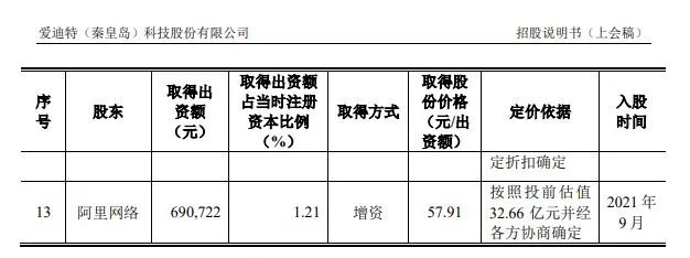 根据招股书,2021年8月17日,爱迪特及公司其他股东与阿里巴巴(中国)网络技术有限公司(阿里网络)就上述投资事宜签署了《关于爱迪特(秦皇岛)科技股份有限公司之投资协议》,协议约定:投资人按照公司投前估值 32.66亿元,以现金出资的方式投资共计 4,000.00万元,对应新增注册资本69.07万元。招股书显示,这次入股最终于2021年9月完成。
