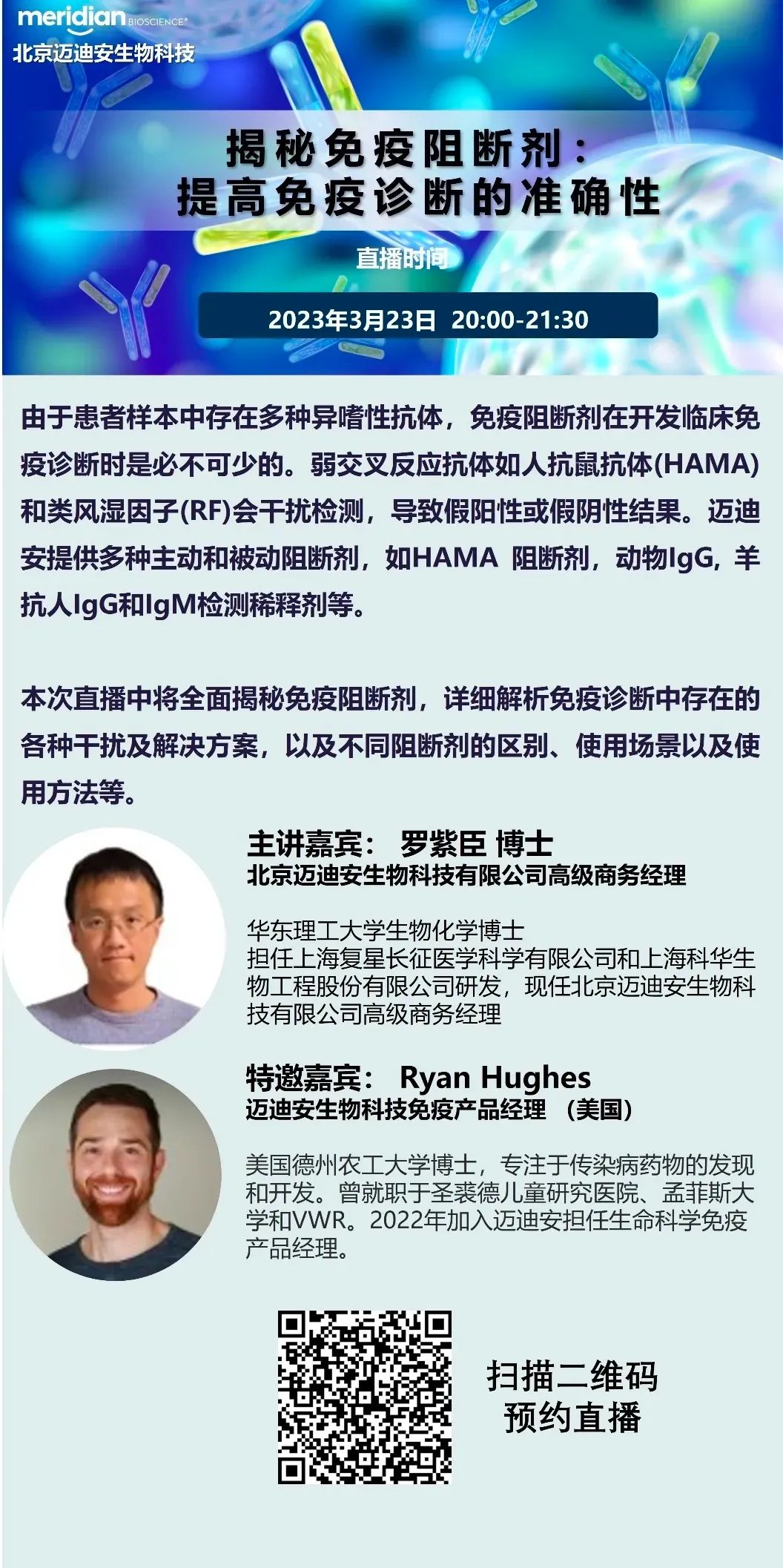 欢迎参加迈迪安举办的直播,带您全面揭秘免疫阻断剂,了解其使用场景、使用方法、不同阻断剂的区别,助力您的免疫诊断检测开发,现在扫码预约吧!