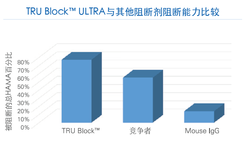 尤其是迈迪安专利生产的主动阻断剂TRU BlockTM ,它含有一种针对所有类型嗜异性干扰包括 HAMA 和 RF 的特异性粘合剂, 能够显著减少试验干扰和改善试验结果。一旦与干扰抗体结合, TRU BlockTM 会通过位阻进一步阻止HA与其它试验成分结合。这种主动阻断剂的使用浓度通常低于被动阻断剂如动物IgG, 使一般与被动阻断剂有关的试验信号减少最小化,实现更高的检测性能。