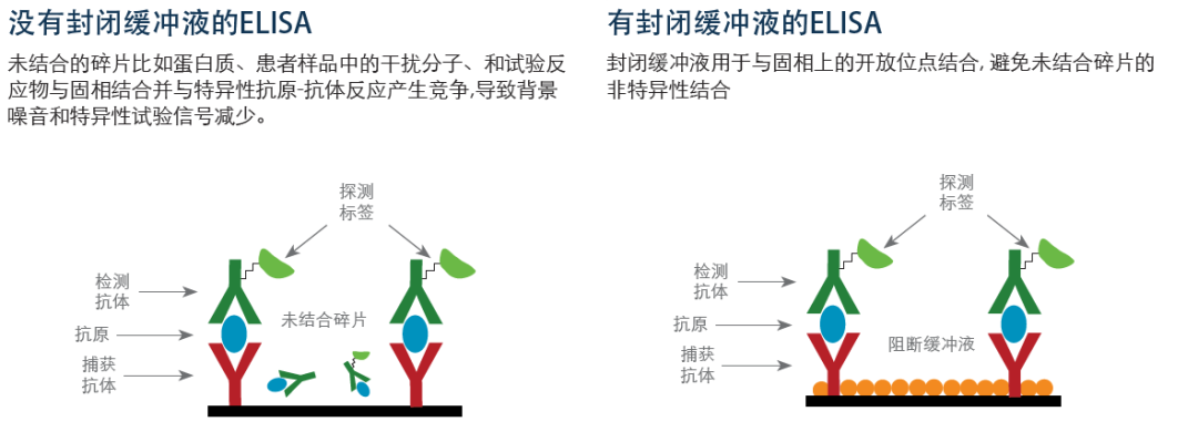 固相阻断剂专门用于使未被结合的结合位点饱和, 从而防止非特异性结合,同时增加检测灵敏度。在样品制备过程中再使用其它阻断剂来防止干扰抗体与试验抗体成分结合。