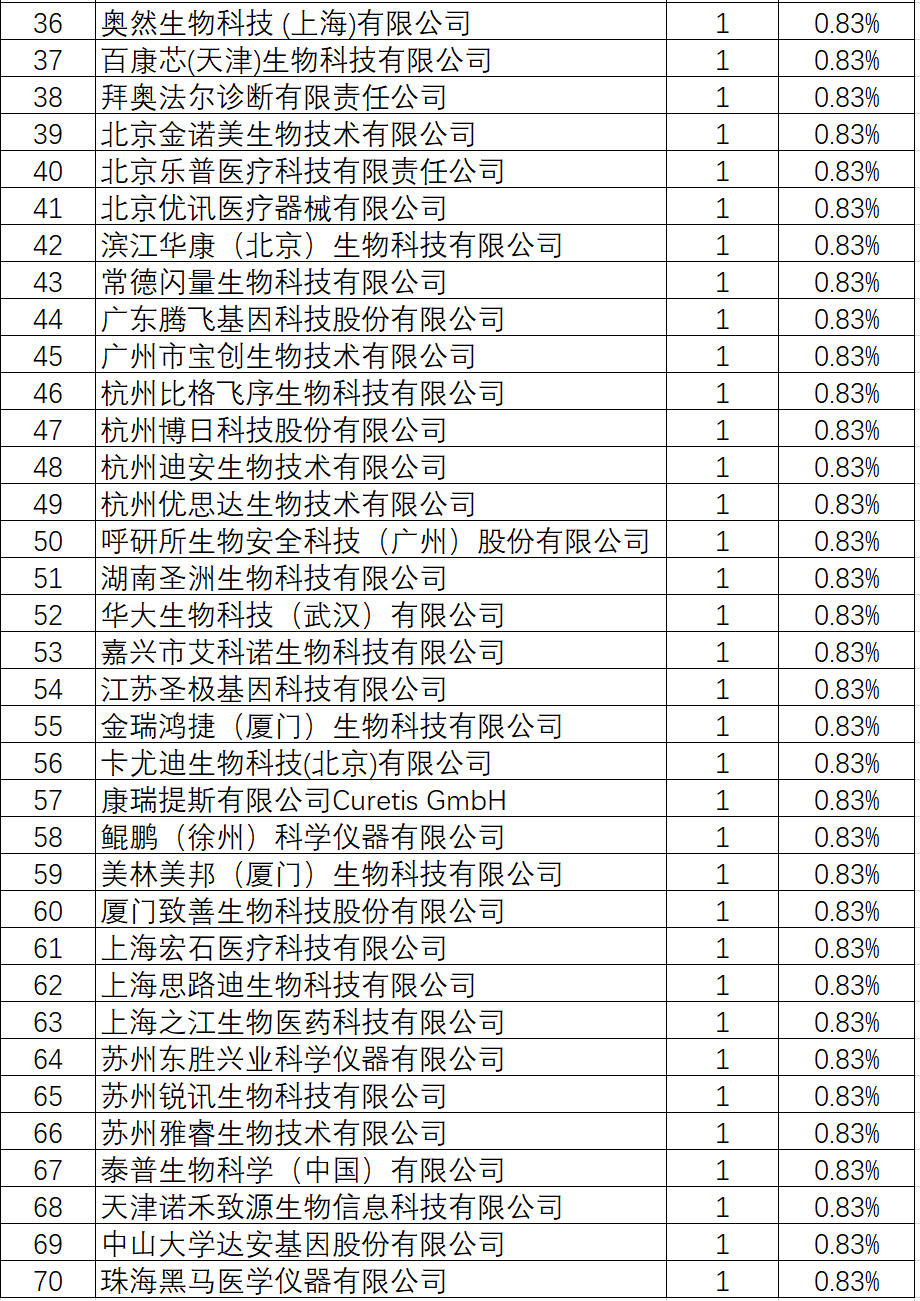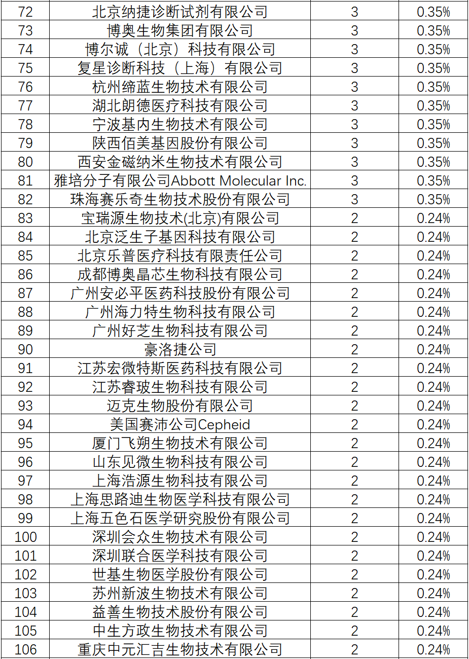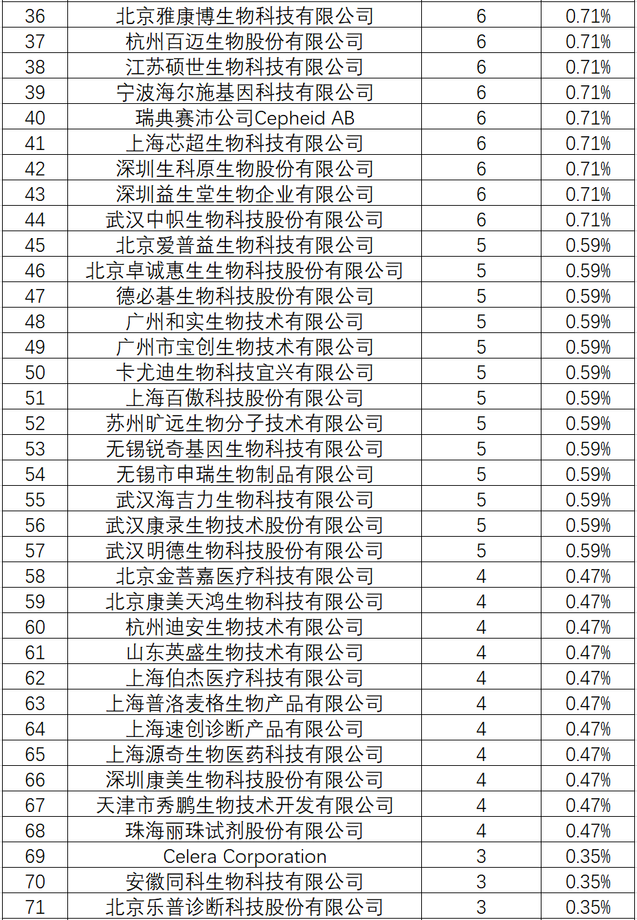 三、数字PCR 它是一种核酸分子绝对定量技术。相较于PCR,数字PCR能够直接数出DNA分子的个数,是对起始样品的绝对定量。数字PCR发展较PCR晚一些,截止到今天,共23款仪器获证,涉及16家公司,只有一款试剂盒获证,具体数据见表9。数字PCR领域,全部都是国产仪器(境外公司还没有直接入场)。
