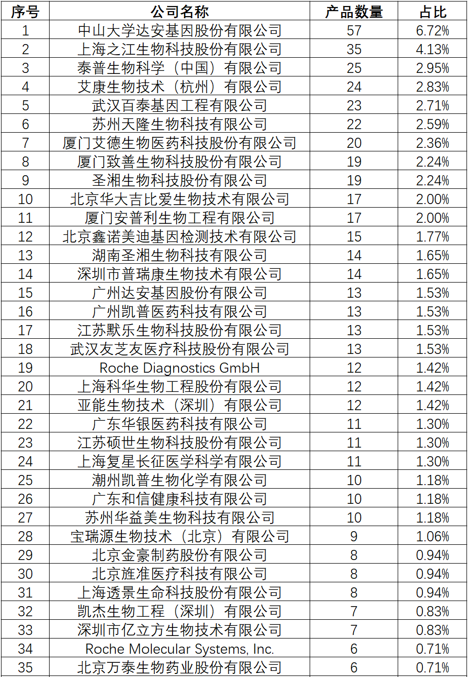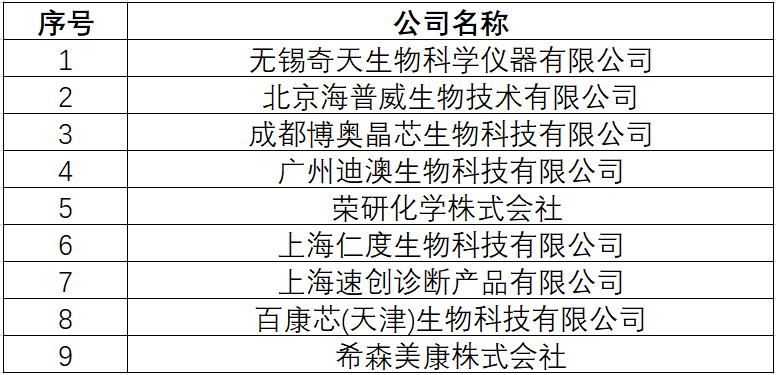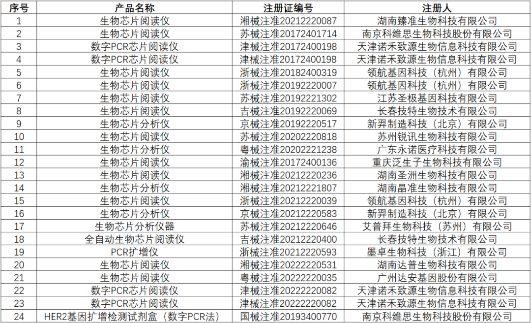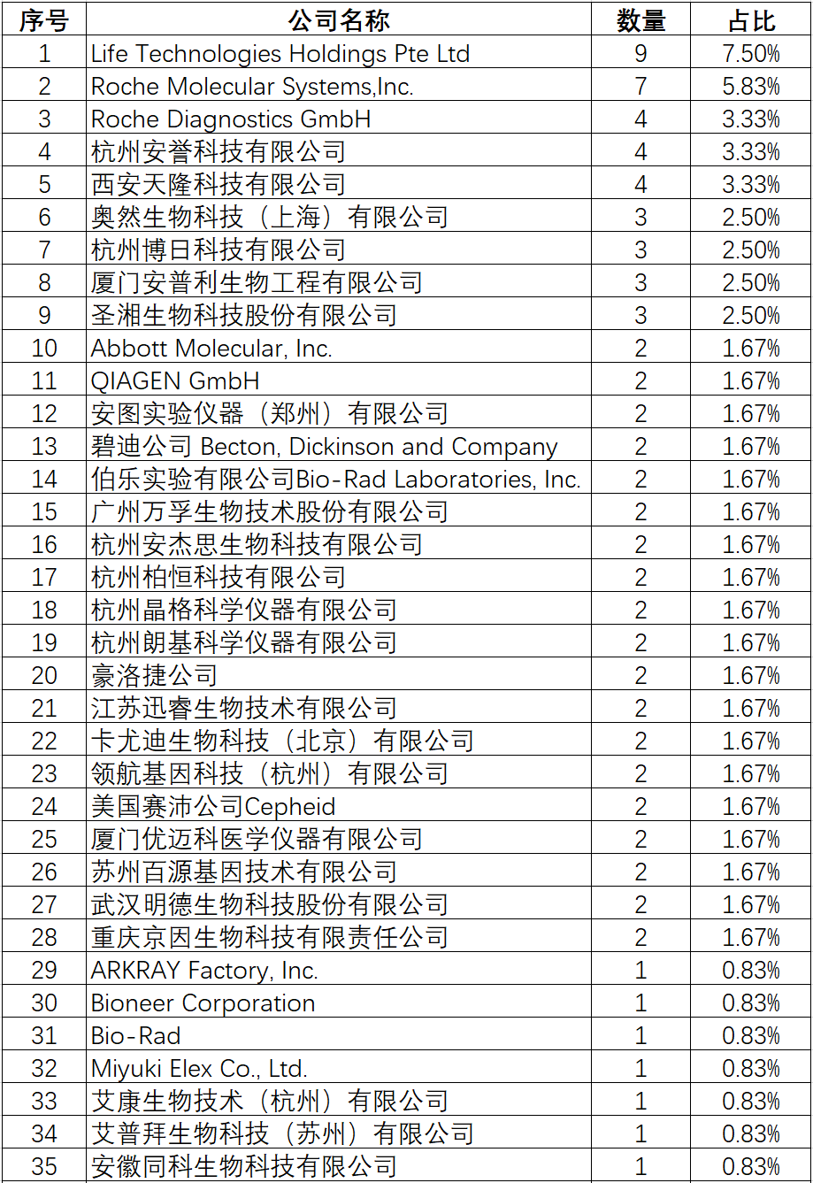 三、数字PCR 它是一种核酸分子绝对定量技术。相较于PCR,数字PCR能够直接数出DNA分子的个数,是对起始样品的绝对定量。数字PCR发展较PCR晚一些,截止到今天,共23款仪器获证,涉及16家公司,只有一款试剂盒获证,具体数据见表9。数字PCR领域,全部都是国产仪器(境外公司还没有直接入场)。