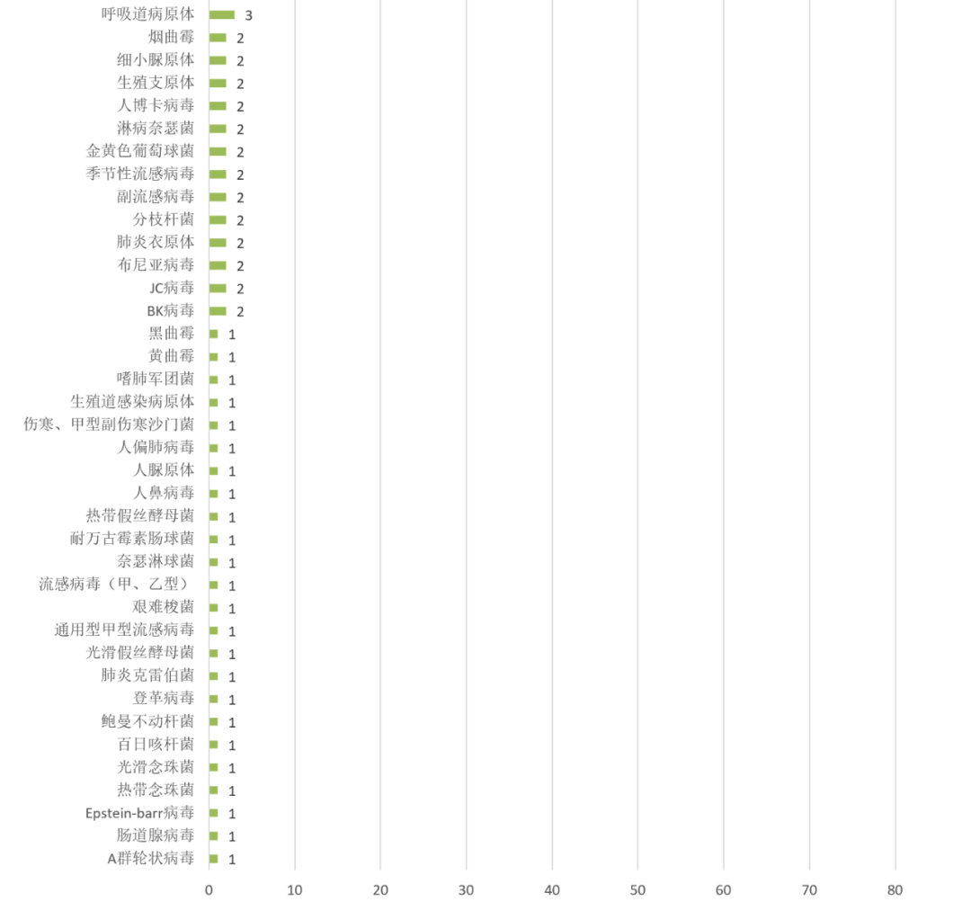 PCR类试剂盒中,有的直接采用PCR进行分析,有的是PCR结合其他方法一起分析,上述的848个PCR类试剂盒中共涉及了53种方法学(根据试剂盒名称获得数据),具体数据见图9。