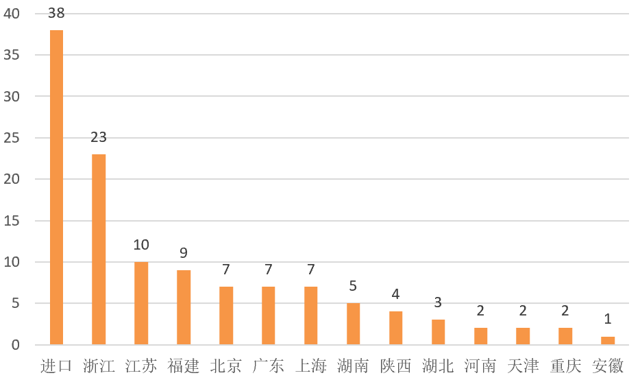 获证公司主要集中在经济发达省份,其中,浙江、江苏、福建、北京、广东是获批产品排前五名的省份(该处进口不排名),具体数据看图14。 图14 PCR仪器省份分布
