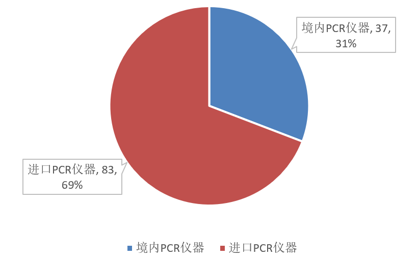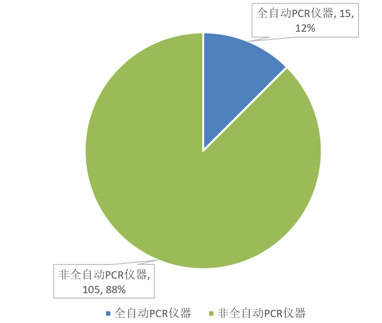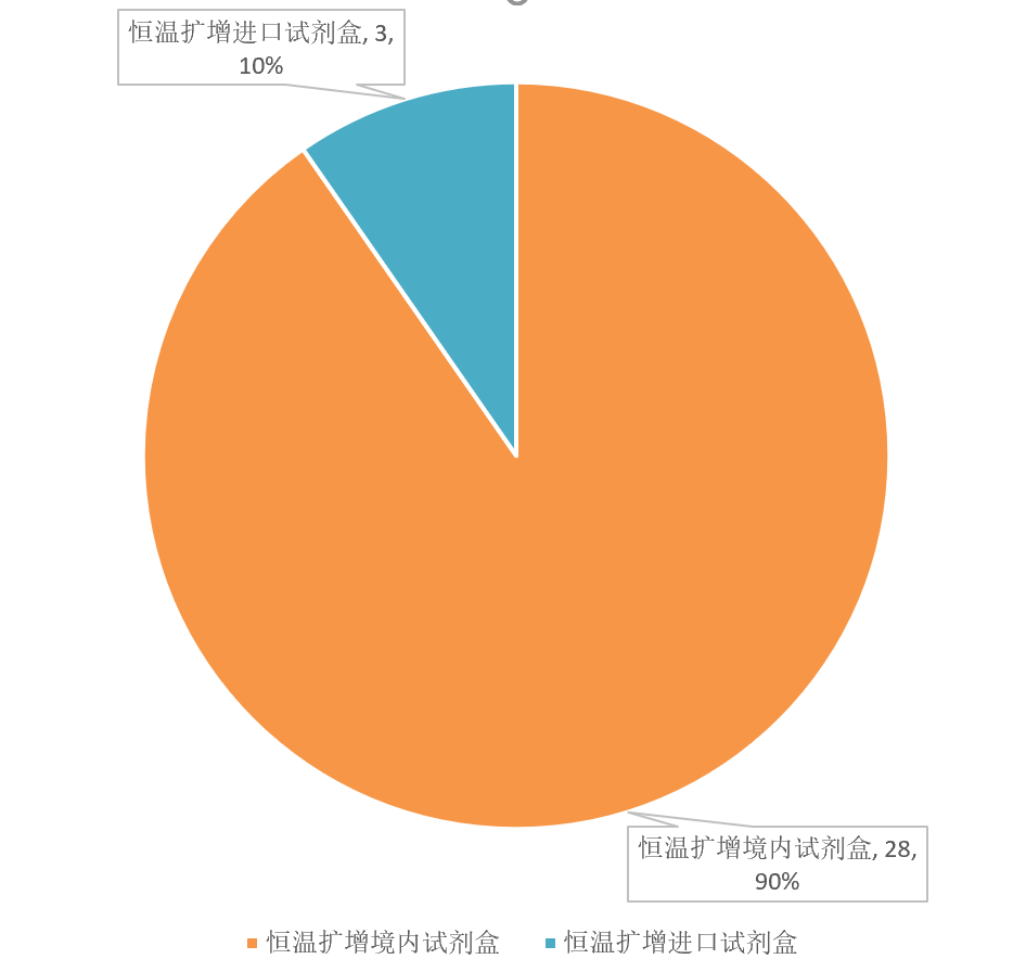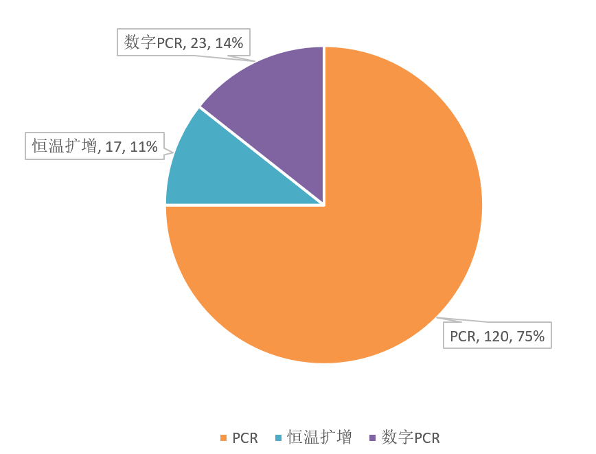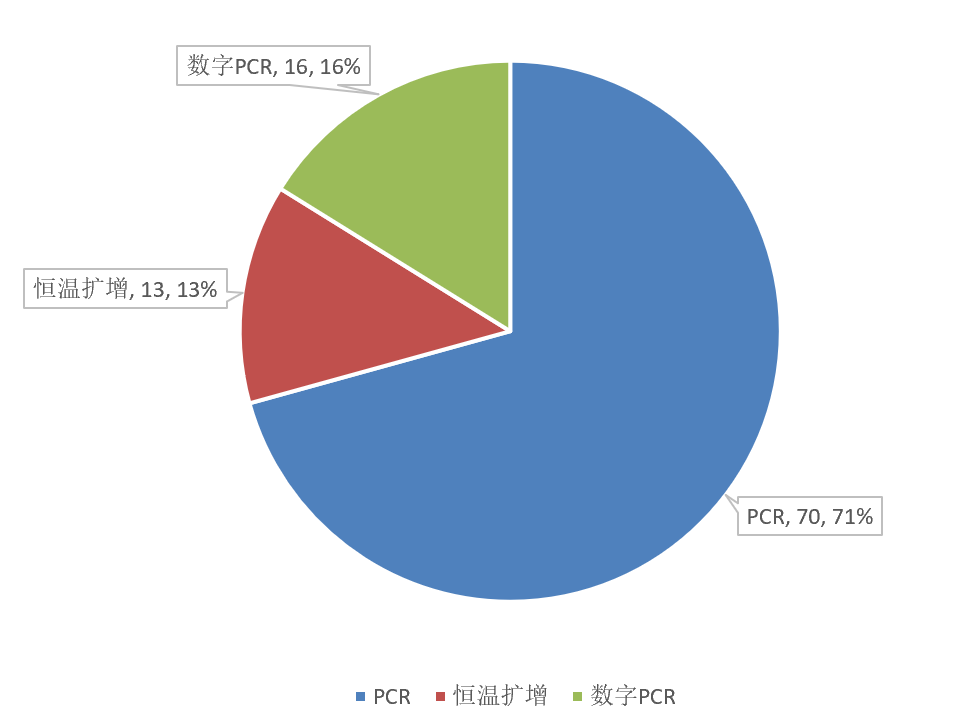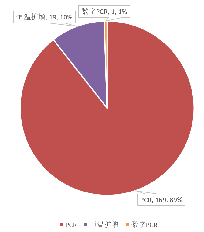 图1 核酸扩增仪器分布图 图2 核酸扩增仪器公司分布图 图3 核酸扩增试剂盒分布图 图4 核酸扩增试剂盒公司分布图 由于PCR类、恒温扩增类和数字PCR类等产品有较大的差异,后续会对该三类产品进行分开统计分析,以便能更全面的展示核酸扩增类产品的现状。