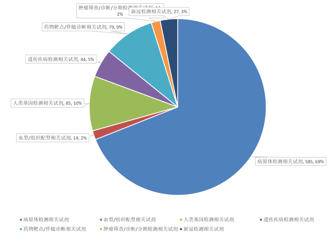 获批的PCR产品共涉及《体外诊断试剂分类规则》第三类中的6个小项:病原体检测相关试剂、血型/组织配型相关试剂、人类基因检测相关试剂、遗传疾病检测相关试剂、治疗药物靶点/伴随诊断检测相关试剂和肿瘤筛查/诊断/分期等相关试剂,加上新冠检测相关试剂(该处把新冠从病原体检测相关试剂分离出来单独统计),共7项(以上分类仅供统计分析,有些产品分类可能存在不同的看法),病原体检测相关试剂数量最多:585款产品(69%),具体数据看图8。