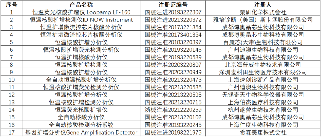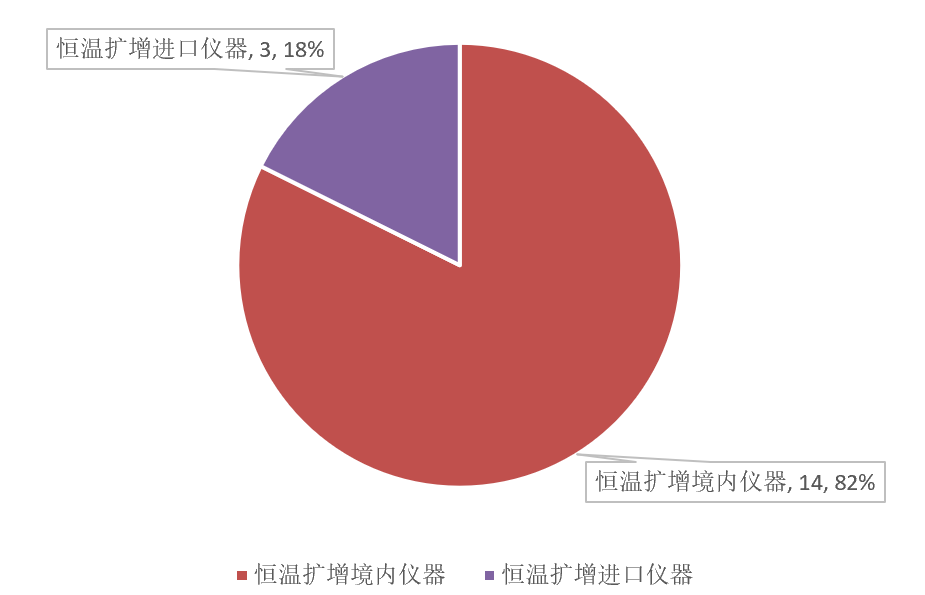 图15 恒温扩增试剂境内外分布图 表 6 恒温扩增试剂盒列表 (二)恒温扩增仪器 NMPA共批准了17款仪器,境内产品占主要,具体数据见图16,涉及13家公司,具体数据见表7。恒温扩增仪器中出现了核酸提取-扩增分析的一体式仪器。 图16 恒温扩增仪器境内外分布图 表 7 恒温扩增仪器列表
