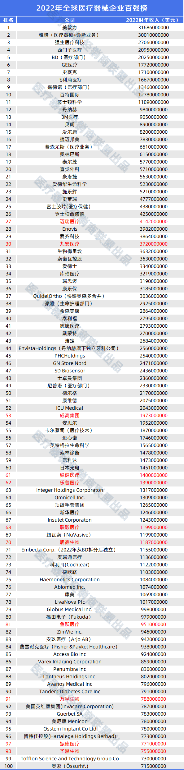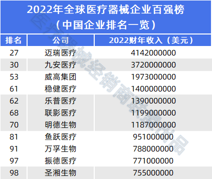 据统计,本次入选百强的所有械企总年营收达到了4472.4亿美元。其中全球医疗器械企业TOP10排名大变动! 其中,美敦力、雅培、强生医疗科技排名前三,美敦力以316.86亿美元年营收依旧高居榜首。 雅培(医疗器械+诊断业务)受新冠检测业务提升等影响,以300.1亿美元年营收,排名一跃从全球第九跃升至全球第二。强生医疗科技排名全球第三,西门子医疗排名全球第四。 全球医疗器械TOP10中,排名变动最大的除了雅培(医疗器械+诊断业务),就是飞利浦医疗。 受到呼吸机召回、供应链、通胀、汇率等不利影响,飞利浦医疗2022年营收增长仅为+3%,调整后息税前净利润-43%。其排名从全球第四下滑至全球第八。 本次2022年全球医疗器械百强榜,最大的亮点便是国产医疗器械企业全面突围! 迈瑞医疗、九安医疗进入全球TOP30; 威高集团排名全球第53; 稳健医疗、乐普医疗、新华医疗、联影医疗、明德医疗进入全球TOP70;(补充:新华医疗全球第66) 鱼跃医疗排名全球第84;万孚生物、振德医疗、圣湘生物分别排名全球第91、第97、第98。 最新的《中国医疗器械行业发展现状与趋势》报告显示,2022年中国医疗器械市场规模预计达9582亿元(人民币,下同),近7年复合增速约17.5%,已跃升为全球第二大市场。 回望中国医疗器械三十年发展历程,从代理、仿制到微创新、全面创新,国产医疗器械产业的步伐不断向前,影像设备、心血管、IVD等细分赛道突破创新,市场占有率不断提升。 国产扩容、行业产能出清、市场渗透率提升,以及海外市场拓展,正在发生的事实都指向一个结果,给国产器械龙头腾出更多的增量空间! 这将是国产医疗器械企业,诞生国际器械巨头最好的时代 ! 注:以上内容仅供参考,不构成投资建议,本文中对官方政策的相关解读,仅代表本平台观点,内容以官方文件为准。如有平台转载本篇文章,须自行对该篇文章负责,医疗器械经销商联盟不对转载引起的二次传播影响负责。 |