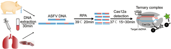 “吐露”心声:1921年,非洲出现的一头眼鼻分泌粘稠物、皮肤绀紫、并且发着高烧、呼吸困难的猪拉开了“非洲猪瘟”的序幕。尽管非洲猪瘟并不会造成“人畜共患病”的现象,但该病高达100%的急性致死率仍旧给人类畜牧业造成了极大的损失。如何快速检测非洲猪瘟成了一道亟待攻克的难题。本周,小编为大家带来了运用CRISPR技术快速现场检测非洲猪瘟病毒的方法,快和小编一起看看吧! 非洲猪瘟(African swine fever,ASF)是由非洲猪瘟病毒(African swine fever virus,ASFV)引起的一种急性、热性、高度接触性传染病,病死率接近100%。我国自2018年8月确诊第一例ASF以来[1,2],已经捕杀或活埋一百多万头猪,使国家养猪业蒙受巨大损失。