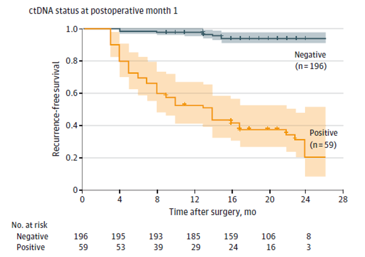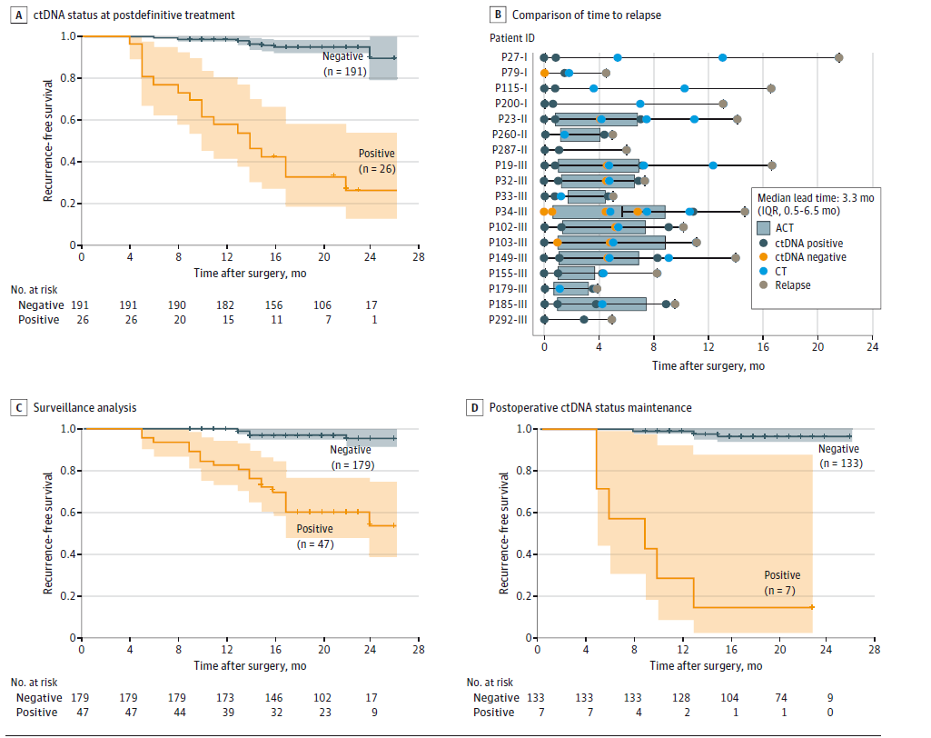 近日,JAMA Oncology(IF 33)上刊载了由复旦大学附属肿瘤医院蔡国响教授团队、上海交通大学医学院附属仁济医院王争教授团队等联合鹍远生物的重要科研成果[1]:“Early Detection of Molecular Residual Disease and Risk Stratification for Stage I to III Colorectal Cancer via Circulating Tumor DNA Methylation(循环肿瘤DNA甲基化检测用于I-III期结直肠癌MRD早期发现及复发风险分层)”。 该研究是国际上首个应用基于PCR的血液ctDNA多基因甲基化技术于结直肠癌复发预测和复发监测的多中心研究,提供了一个与现有MRD检测技术方法相比性价比更高的技术路径和解决方案,有望大大提高结直肠癌复发预测和监测的临床使用普及率,并显著改善病人的生存期和生存质量。该研究也得到了期刊及编辑们的高度评价,列为本期重点推荐论文,并邀请了来自西班牙的Juan Ruiz-Bañobre教授和美国的Ajay Goel教授进行点评。美国著名的生物医药专业媒体GenomeWeb也对本研究进行了报道。 文章发表在JAMA Oncology 结直肠癌(CRC)位列世界癌症相关死亡的第二位[2],5年生存率仅60%[3],复发率相对较高。循环肿瘤DNA(ctDNA)检测已成为肿瘤领域的诊疗新热点[4-5],现有研究多聚焦基于高通量测序技术(NGS)的ctDNA突变,其流程复杂、周期长、成本较高[6],普适性略有不足。 本研究基于鹍远生物自主研发的CRC多基因甲基化检测技术ColonAiQ®常艾克®,在前期研究基础上(2021年发表于Gastroenterology杂志)[7],进一步充分证实了循环肿瘤DNA甲基化在I-III期结直肠癌中的潜在临床应用——复发风险分层、指导治疗决策和早期复发监测等,为这一无创血液筛查和监测技术纳入临床实践提供一定参考依据,并有望成为一个新的兼具灵敏度、时效性和经济性,惠及众多结直肠癌患者的MRD检测新指标。 ▸术后1个月(POM1),ctDNA阳性患者复发风险是阴性患者的17.5倍。若ctDNA和癌胚抗原(CEA)联合检测,则阳性与阴性的复发风险比(HR)为19.0 (P < 0.001)。 ▸接受不同辅助治疗周期/强度的患者,ctDNA均与其预后显著相关,且辅助治疗后ctDNA阳性的复发风险是阴性的13.8倍(P < 0.001)。 ▸根治性治疗后(HR,20.6; P < 0.001)及后续随访监测过程中(HR,68.8; P < 0.001),ctDNA阳性者相较阴性的无复发生存(RFS)率更低。ctDNA分析可比影像学诊断最多提前20个月提示肿瘤复发。 研究方法 本研究最终纳入299名R0切除的I-III期结直肠癌患者,并采集术前(7天)、术后1个月及辅助治疗(ACT)后随访各时点(间隔3个月)的血液样本合计1228份。主要研究终点为RFS。 图1 患者招募分组流程 重要研究结果 1、 POM1:ctDNA可预测CRC患者的复发风险 ➣ ctDNA阳性患者的复发风险显著高于阴性(HR,17.5;P<0.001)(图2)。其预测复发的灵敏度为78.0%,特异度90.2%,并在不同分期的肠癌中都保持稳健。 ➣ ctDNA预测复发的性能优于CEA。 ➣ ctDNA和CEA联合检测可提高预测复发的性能(AUC=0.849),优于ctDNA(AUC=0.839)和CEA(AUC=0.623),且阳性患者相较而言预后更差(HR,19.0;P<0.001)。 图2 POM1时的血浆ctDNA状态以预测CRC的复发 (Kaplan-Meier生存分析,以POM1时的ctDNA状态分层。ctDNA阳性患者的复发风险显著高于阴性患者(HR,17.5;95% CI,8.9-34.4;P<0.001)。) 2、 POM1:ctDNA可实现复发风险分层,指导治疗决策,避免过度治疗 研究团队将III期CRC患者依据临床复发风险评估(高风险(T4/ N2)和低风险(T1-3N1))和辅助治疗周期(3/6个月)划分为不同亚组。 ctDNA阳性: ➣ 高风险人群中,接受6个月辅助治疗的患者复发风险更低; ➣ 低风险人群中,辅助治疗周期与患者复发风险间无显著相关; ctDNA阴性: ➣ 无论临床复发风险与辅助治疗周期,预后均显著优于ctDNA阳性患者; 此外,未接受辅助治疗的I期和低风险II期CRC患者中,66.7% ctDNA阳性患者(4/6)2年内复发,而所有ctDNA阴性患者均未在2年内复发; 3、 综合治疗(手术+ACT或单纯手术)结束及后续随访:ctDNA可比影像学最多提前20个月提示肿瘤复发 ➣ 综合治疗结束后,ctDNA阳性患者的RFS与阴性患者相比显著降低(HR,20.6;P<0.001); ➣ ctDNA可比影像学检查最多提前20个月提示肿瘤复发(图3B); ➣ 在治疗后随访监测的任一时间点, ctDNA阳性皆与更差的预后有关(HR,13.5;P<0.001)(图3C); ➣ ctDNA检测持续阳性的患者RFS显著低于检测持续阴性的患者(HR,68.8;P<0.001)(图3D); 图3 基于纵向队列的ctDNA分析以监测CRC复发 在这篇论文发表的同期,Juan Ruiz-Bañobre 教授和Ajay Goel 教授做了如下点评和推荐: “大量结直肠癌的转化医学研究引领学科发展,尤其是基于ctDNA的MRD检测展现了巨大的潜力,可以通过实现复发风险分层、指导治疗决策和早期复发监测,提升结直肠癌患者的术后管理。 选择DNA甲基化作为新型MRD标志物,相比于突变检测,优势在于不需要做肿瘤组织的全基因组测序筛选,直接用于血液检测,而且避免因检出源自正常组织、良性疾病和克隆性造血的体细胞突变而导至假阳性结果。 本研究以及其他相关研究证实,基于ctDNA的MRD检测是I-III期结直肠癌术后复发的最重要的独立风险因素,可用以协助指导治疗决策,包括辅助治疗的“升级“和”降级“,实现精准治疗。 当下MRD领域发展非常迅速,涌现了大量基于表观遗传学(DNA 甲基化和片段组学)、基因组学(超深度靶向测序或全基因组测序)的创新性、高灵敏度、高特异度的检测技术。我们期待ColonAiQ®继续组织大规模临床研究,可以成为一个兼具可及性、高性能和经济性的MRD检测新指标,能广泛应用于常规临床实践中。“ |