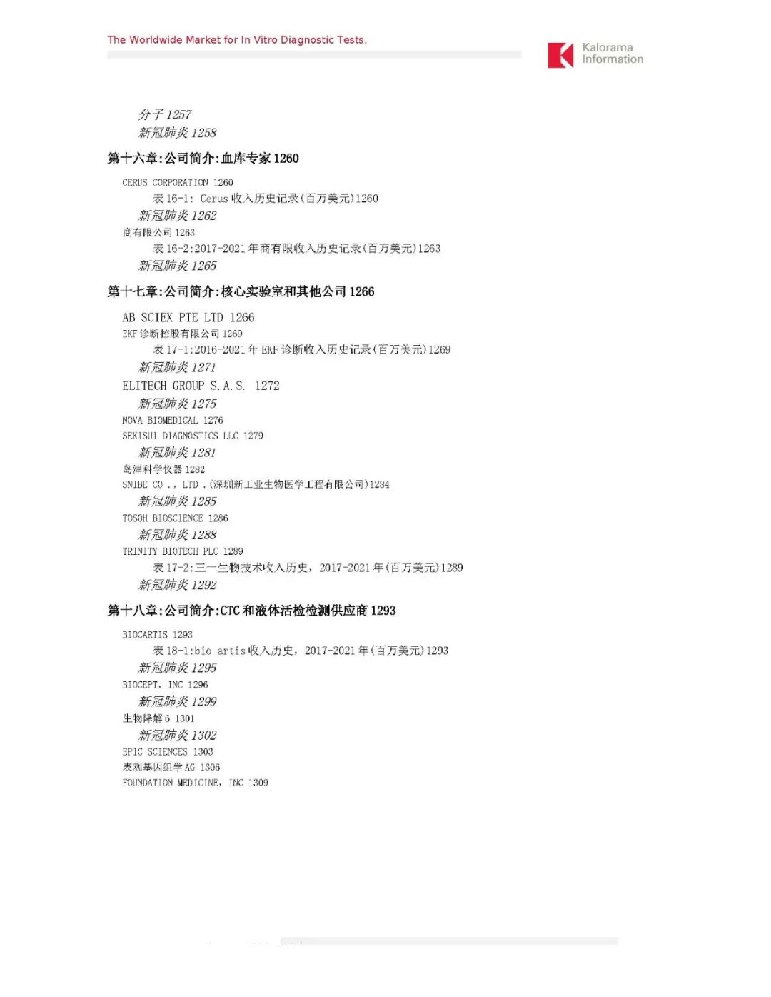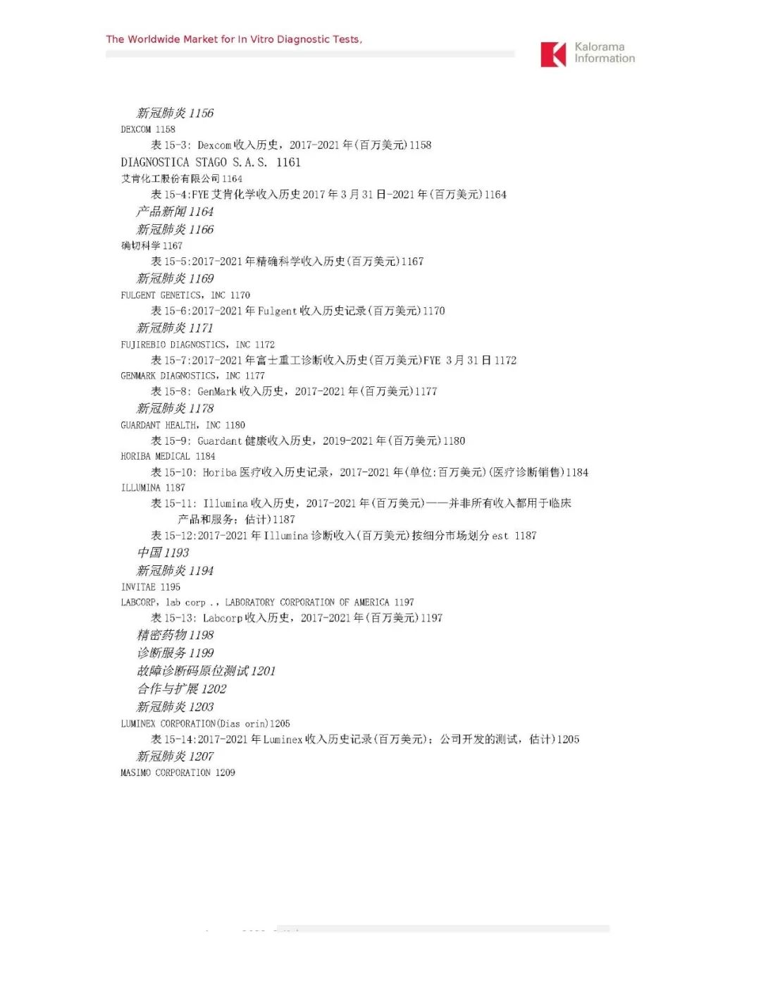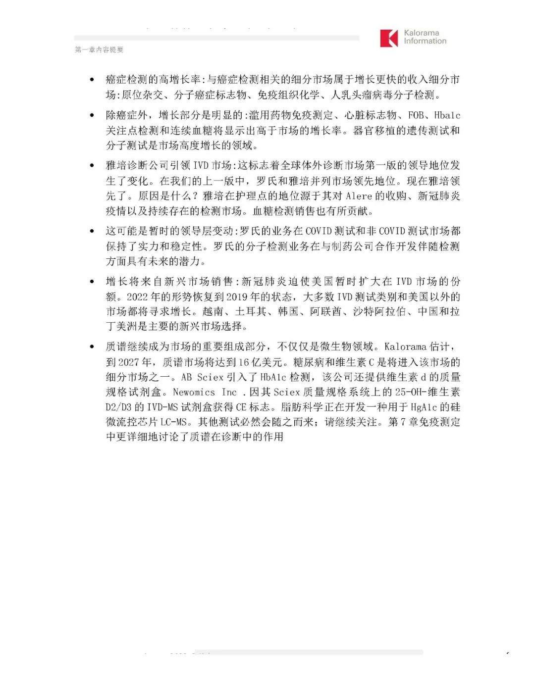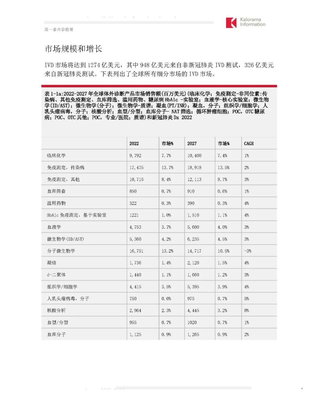 Kalorama Information在《全球IVD市场(第15版)》报告提供全球IVD (体外诊断) 检验市场相关调查,市场概要,各市场区隔/细分区隔的市场规模与预测,及主要各地区/国家的市场的分析与预测,以及各市场区隔的主要企业的简介等。 最近几年,体外诊断显然成为医疗健康产业与资本市场关注的重点,即使放在全球,体外诊断也是个极具潜力的风口行业,在精准医疗的风口之下,体外诊断行业迎来了非常好的发展时期,著名医疗保健市场调查公司Kalorama Information发布的报告《The World wide Market for In Vitro Diagnostic Tests,15th Edition》。 IVD市场亮点 以下是该报告的一些亮点: 从IVD市场的角度来看,新冠肺炎是长期存在的:自新冠肺炎登陆以来,已有近6亿人感染,600万人死亡。诊断市场的维持需要依赖疾病的威胁来进行测试销售。根据任何流行病学和市场计算,新冠肺炎将是一个健康问题,足以保证在整个五年预测期内进行检测,这是卡洛拉马目前的评估。2022年,对新冠肺炎的测试预计将为市场增加近330亿美元。 整合趋势加强:新冠肺炎加强而不是打破了IVD公司的整合趋势。有人认为情况可能相反,疫情带来了许多新的小公司。然而,较大的公司拥有更强的分销和生产能力,以及实验室的信誉。整合继续并得到加强,因为大型ivd具备疫情水平测试所需的能力。2022年,IVD顶级公司的IVD产品销售额约为1,010亿美元,而2021年为970亿美元,2020年为750亿美元,2019年为610亿美元,2018年为580亿美元,2017年为250亿美元,2016年为470亿美元。这表明2016-2022年顶级收入增长了约13.7%。 癌症检测的高增长率:与癌症检测相关的细分市场属于增长更快的收入细分市场:原位杂交、分子癌症标志物、免疫组织化学、人乳头瘤病毒分子检测。 除癌症外,增长明显的细分市场包括:滥用药物免疫测定、心脏标志物、FOB、Hba1c关注点检测和连续血糖将显示出高于市场的增长率。器官移植的遗传测试和分子测试也是市场高度增长的领域。 雅培诊断公司引领IVD市场:这标志着全球体外诊断市场头部公司的领导地位发生了变化。在我们的上一版中,罗氏和雅培并列市场领先地位。现在雅培领先了。原因是什么?雅培在快速诊断的地位源于其对Alere的收购、新冠肺炎疫情以及持续存在的检测市场。血糖检测销售也有所贡献。 这可能是暂时的领导层变动:罗氏的业务在COVID测试和非COVID测试市场都保持了实力和稳定性。罗氏的分子检测业务在与制药公司合作开发伴随检测方面具有未来的潜力。 增长将来自新兴市场销售:新冠肺炎迫使美国暂时扩大在IVD 市场的份额。2022年的形势恢复到2019年的状态,大多数IVD测试类别和美国以外的市场都将寻求增长。越南、土耳其、韩国、阿联酋、沙特阿拉伯、中国和拉丁美洲是主要的新兴市场选择。 质谱继续成为市场的重要组成部分,不仅仅是微生物领域。Kalorama估计,到2027年,质谱市场将达到16亿美元。糖尿病和维生素C是将进入该市场的细分市场之一。AB Sciex引入了HbA1c检测,该公司还提供维生素d的质量规格试剂盒。Newomics Inc .因其Sciex 质量规格系统上的25-OH-维生素D2/D3的IVD-MS试剂盒获得CE认证。脂肪科学正在开发一种用于HgA1c的硅微流控芯片LC-MS。其他测试必然也会随之而来;请继续关注。第7章免疫测定中更详细地讨论了质谱在诊断中的作用! |