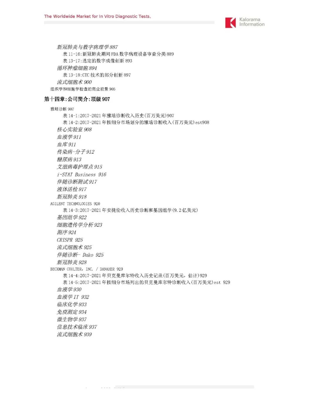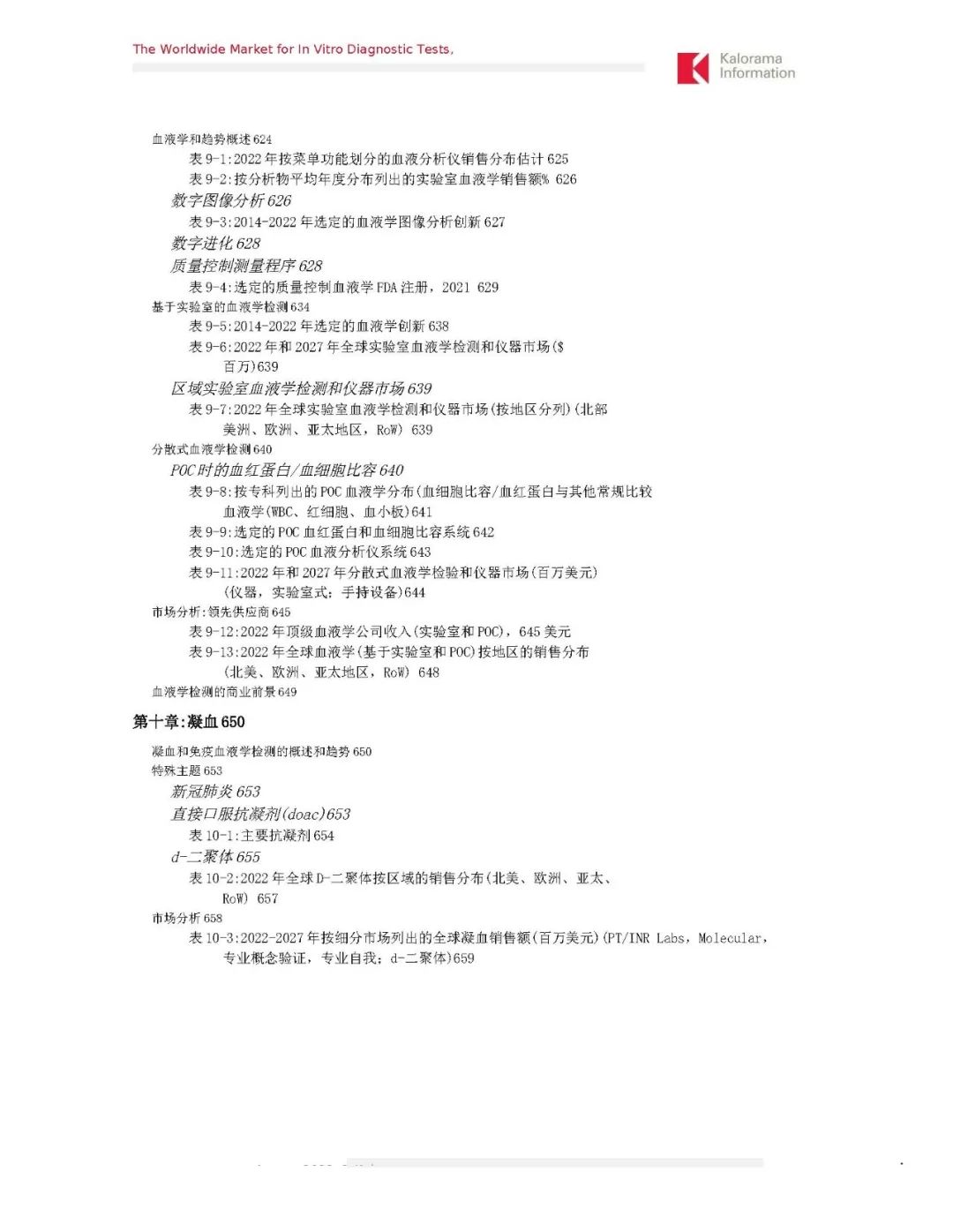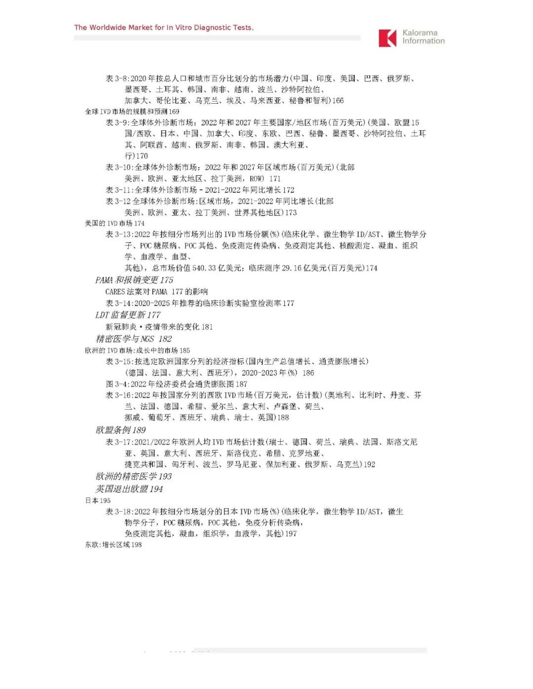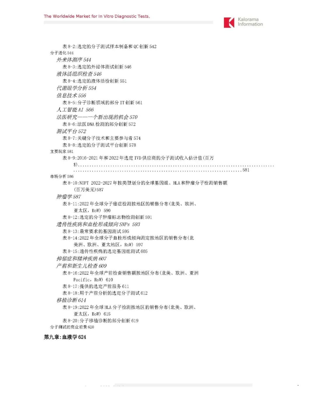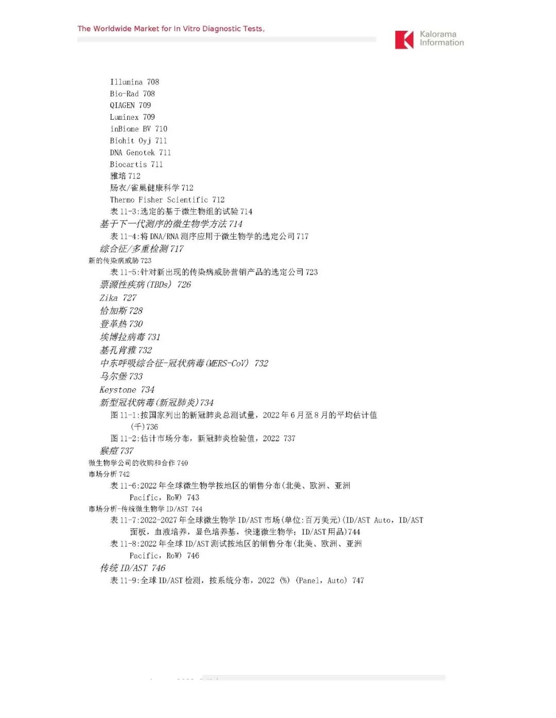 Kalorama Information在《全球IVD市场(第15版)》报告提供全球IVD (体外诊断) 检验市场相关调查,市场概要,各市场区隔/细分区隔的市场规模与预测,及主要各地区/国家的市场的分析与预测,以及各市场区隔的主要企业的简介等。 最近几年,体外诊断显然成为医疗健康产业与资本市场关注的重点,即使放在全球,体外诊断也是个极具潜力的风口行业,在精准医疗的风口之下,体外诊断行业迎来了非常好的发展时期,著名医疗保健市场调查公司Kalorama Information发布的报告《The World wide Market for In Vitro Diagnostic Tests,15th Edition》。 IVD市场亮点 以下是该报告的一些亮点: 从IVD市场的角度来看,新冠肺炎是长期存在的:自新冠肺炎登陆以来,已有近6亿人感染,600万人死亡。诊断市场的维持需要依赖疾病的威胁来进行测试销售。根据任何流行病学和市场计算,新冠肺炎将是一个健康问题,足以保证在整个五年预测期内进行检测,这是卡洛拉马目前的评估。2022年,对新冠肺炎的测试预计将为市场增加近330亿美元。 整合趋势加强:新冠肺炎加强而不是打破了IVD公司的整合趋势。有人认为情况可能相反,疫情带来了许多新的小公司。然而,较大的公司拥有更强的分销和生产能力,以及实验室的信誉。整合继续并得到加强,因为大型ivd具备疫情水平测试所需的能力。2022年,IVD顶级公司的IVD产品销售额约为1,010亿美元,而2021年为970亿美元,2020年为750亿美元,2019年为610亿美元,2018年为580亿美元,2017年为250亿美元,2016年为470亿美元。这表明2016-2022年顶级收入增长了约13.7%。 癌症检测的高增长率:与癌症检测相关的细分市场属于增长更快的收入细分市场:原位杂交、分子癌症标志物、免疫组织化学、人乳头瘤病毒分子检测。 除癌症外,增长明显的细分市场包括:滥用药物免疫测定、心脏标志物、FOB、Hba1c关注点检测和连续血糖将显示出高于市场的增长率。器官移植的遗传测试和分子测试也是市场高度增长的领域。 雅培诊断公司引领IVD市场:这标志着全球体外诊断市场头部公司的领导地位发生了变化。在我们的上一版中,罗氏和雅培并列市场领先地位。现在雅培领先了。原因是什么?雅培在快速诊断的地位源于其对Alere的收购、新冠肺炎疫情以及持续存在的检测市场。血糖检测销售也有所贡献。 这可能是暂时的领导层变动:罗氏的业务在COVID测试和非COVID测试市场都保持了实力和稳定性。罗氏的分子检测业务在与制药公司合作开发伴随检测方面具有未来的潜力。 增长将来自新兴市场销售:新冠肺炎迫使美国暂时扩大在IVD 市场的份额。2022年的形势恢复到2019年的状态,大多数IVD测试类别和美国以外的市场都将寻求增长。越南、土耳其、韩国、阿联酋、沙特阿拉伯、中国和拉丁美洲是主要的新兴市场选择。 质谱继续成为市场的重要组成部分,不仅仅是微生物领域。Kalorama估计,到2027年,质谱市场将达到16亿美元。糖尿病和维生素C是将进入该市场的细分市场之一。AB Sciex引入了HbA1c检测,该公司还提供维生素d的质量规格试剂盒。Newomics Inc .因其Sciex 质量规格系统上的25-OH-维生素D2/D3的IVD-MS试剂盒获得CE认证。脂肪科学正在开发一种用于HgA1c的硅微流控芯片LC-MS。其他测试必然也会随之而来;请继续关注。第7章免疫测定中更详细地讨论了质谱在诊断中的作用! |
