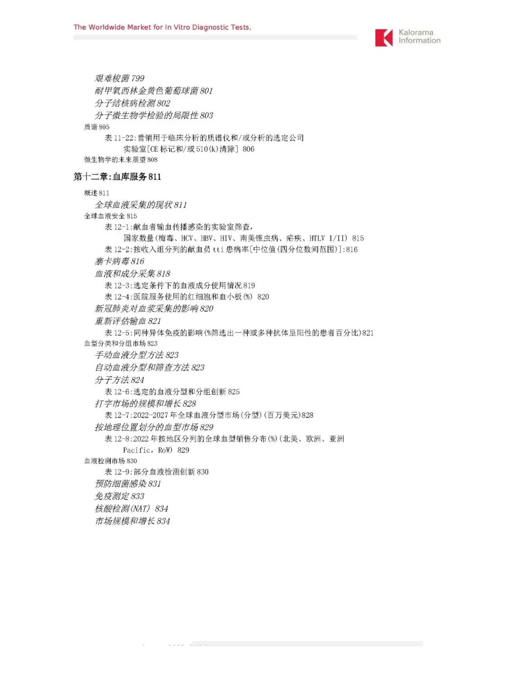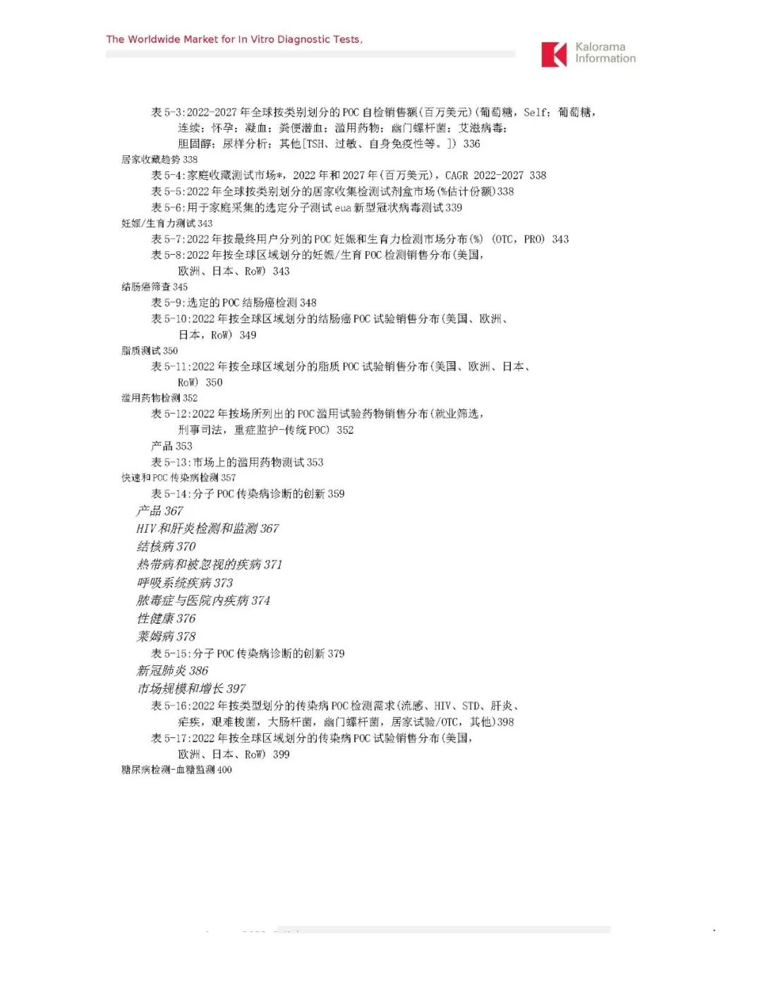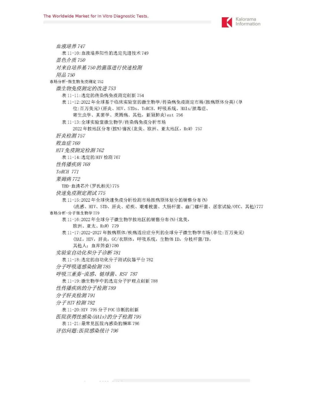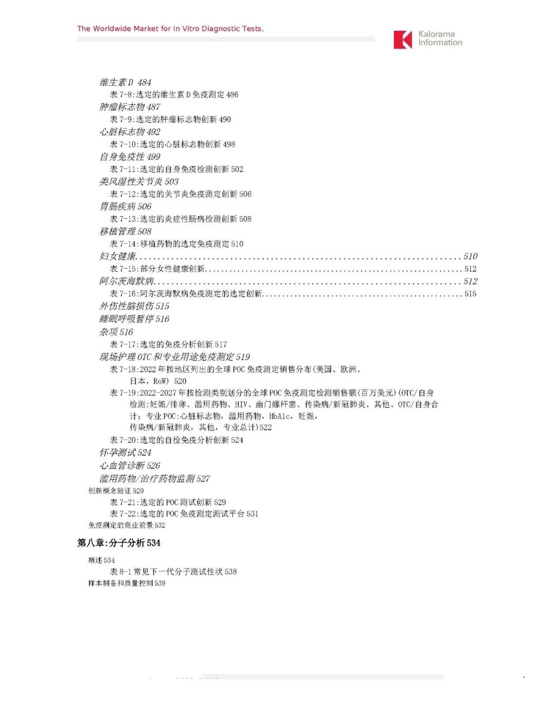Kalorama Information在《全球IVD市场(第15版)》报告提供全球IVD (体外诊断) 检验市场相关调查,市场概要,各市场区隔/细分区隔的市场规模与预测,及主要各地区/国家的市场的分析与预测,以及各市场区隔的主要企业的简介等。 最近几年,体外诊断显然成为医疗健康产业与资本市场关注的重点,即使放在全球,体外诊断也是个极具潜力的风口行业,在精准医疗的风口之下,体外诊断行业迎来了非常好的发展时期,著名医疗保健市场调查公司Kalorama Information发布的报告《The World wide Market for In Vitro Diagnostic Tests,15th Edition》。 IVD市场亮点 以下是该报告的一些亮点: 从IVD市场的角度来看,新冠肺炎是长期存在的:自新冠肺炎登陆以来,已有近6亿人感染,600万人死亡。诊断市场的维持需要依赖疾病的威胁来进行测试销售。根据任何流行病学和市场计算,新冠肺炎将是一个健康问题,足以保证在整个五年预测期内进行检测,这是卡洛拉马目前的评估。2022年,对新冠肺炎的测试预计将为市场增加近330亿美元。 整合趋势加强:新冠肺炎加强而不是打破了IVD公司的整合趋势。有人认为情况可能相反,疫情带来了许多新的小公司。然而,较大的公司拥有更强的分销和生产能力,以及实验室的信誉。整合继续并得到加强,因为大型ivd具备疫情水平测试所需的能力。2022年,IVD顶级公司的IVD产品销售额约为1,010亿美元,而2021年为970亿美元,2020年为750亿美元,2019年为610亿美元,2018年为580亿美元,2017年为250亿美元,2016年为470亿美元。这表明2016-2022年顶级收入增长了约13.7%。 癌症检测的高增长率:与癌症检测相关的细分市场属于增长更快的收入细分市场:原位杂交、分子癌症标志物、免疫组织化学、人乳头瘤病毒分子检测。 除癌症外,增长明显的细分市场包括:滥用药物免疫测定、心脏标志物、FOB、Hba1c关注点检测和连续血糖将显示出高于市场的增长率。器官移植的遗传测试和分子测试也是市场高度增长的领域。 雅培诊断公司引领IVD市场:这标志着全球体外诊断市场头部公司的领导地位发生了变化。在我们的上一版中,罗氏和雅培并列市场领先地位。现在雅培领先了。原因是什么?雅培在快速诊断的地位源于其对Alere的收购、新冠肺炎疫情以及持续存在的检测市场。血糖检测销售也有所贡献。 这可能是暂时的领导层变动:罗氏的业务在COVID测试和非COVID测试市场都保持了实力和稳定性。罗氏的分子检测业务在与制药公司合作开发伴随检测方面具有未来的潜力。 增长将来自新兴市场销售:新冠肺炎迫使美国暂时扩大在IVD 市场的份额。2022年的形势恢复到2019年的状态,大多数IVD测试类别和美国以外的市场都将寻求增长。越南、土耳其、韩国、阿联酋、沙特阿拉伯、中国和拉丁美洲是主要的新兴市场选择。 质谱继续成为市场的重要组成部分,不仅仅是微生物领域。Kalorama估计,到2027年,质谱市场将达到16亿美元。糖尿病和维生素C是将进入该市场的细分市场之一。AB Sciex引入了HbA1c检测,该公司还提供维生素d的质量规格试剂盒。Newomics Inc .因其Sciex 质量规格系统上的25-OH-维生素D2/D3的IVD-MS试剂盒获得CE认证。脂肪科学正在开发一种用于HgA1c的硅微流控芯片LC-MS。其他测试必然也会随之而来;请继续关注。第7章免疫测定中更详细地讨论了质谱在诊断中的作用! |
