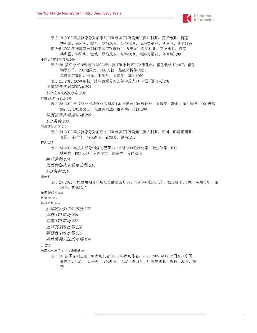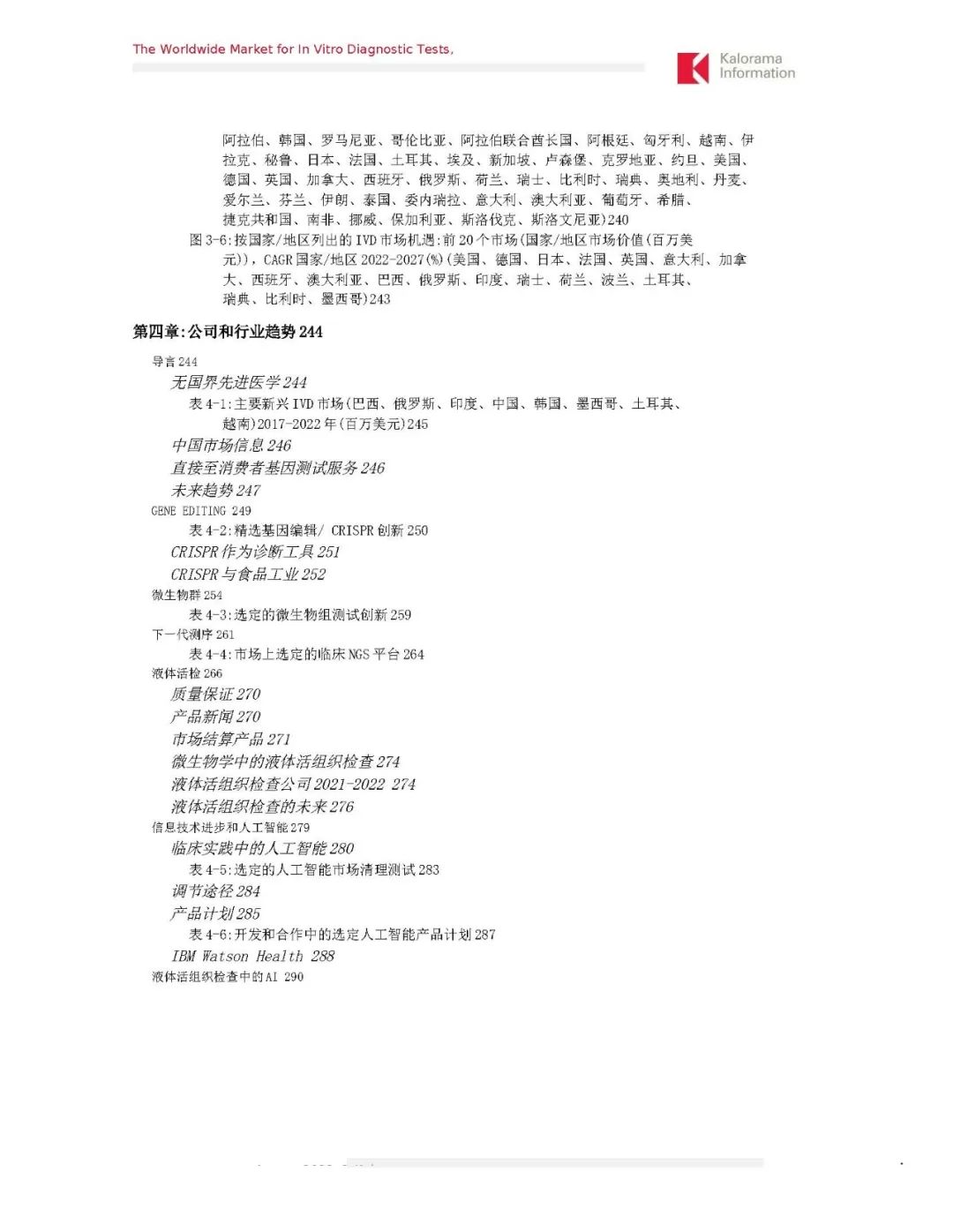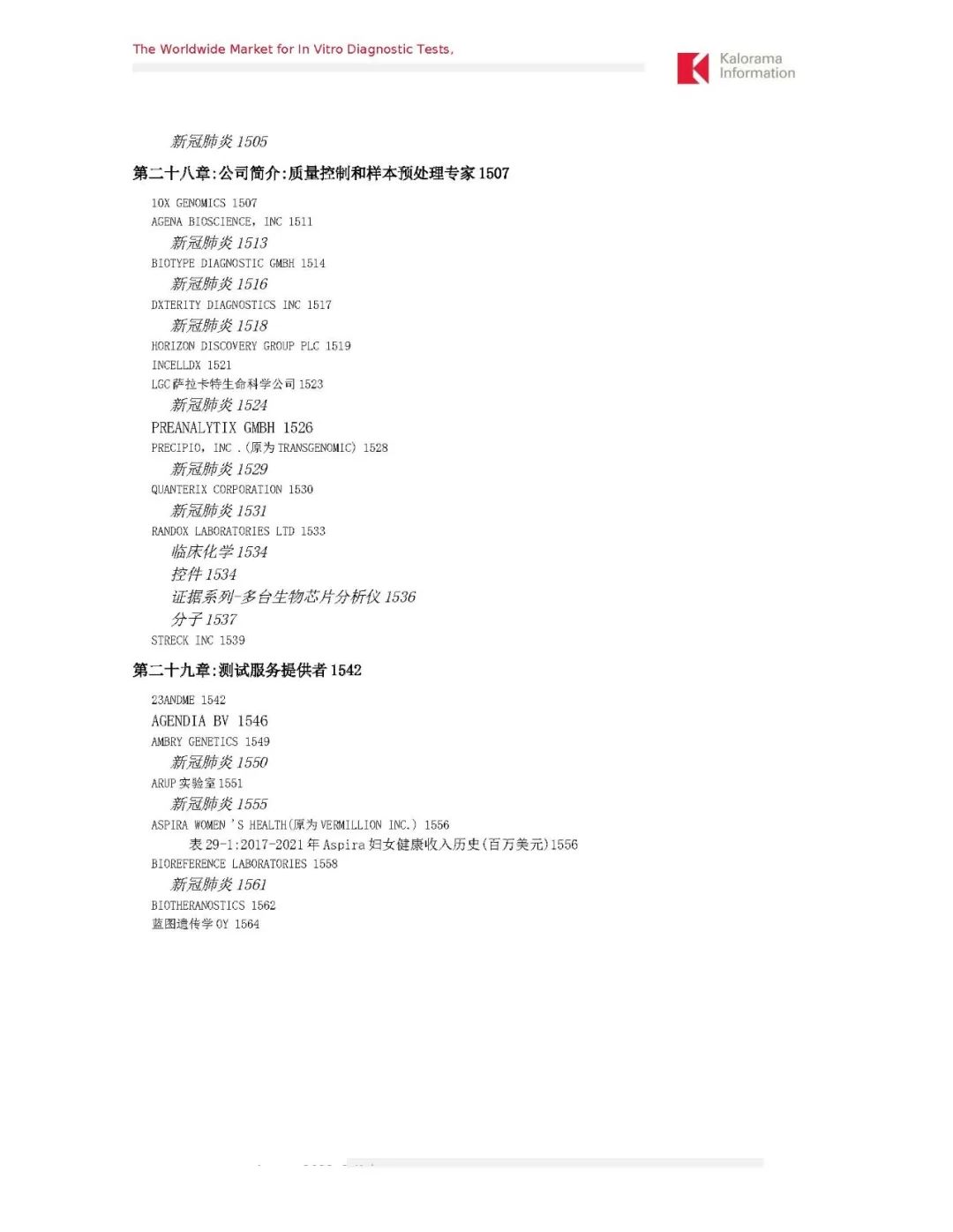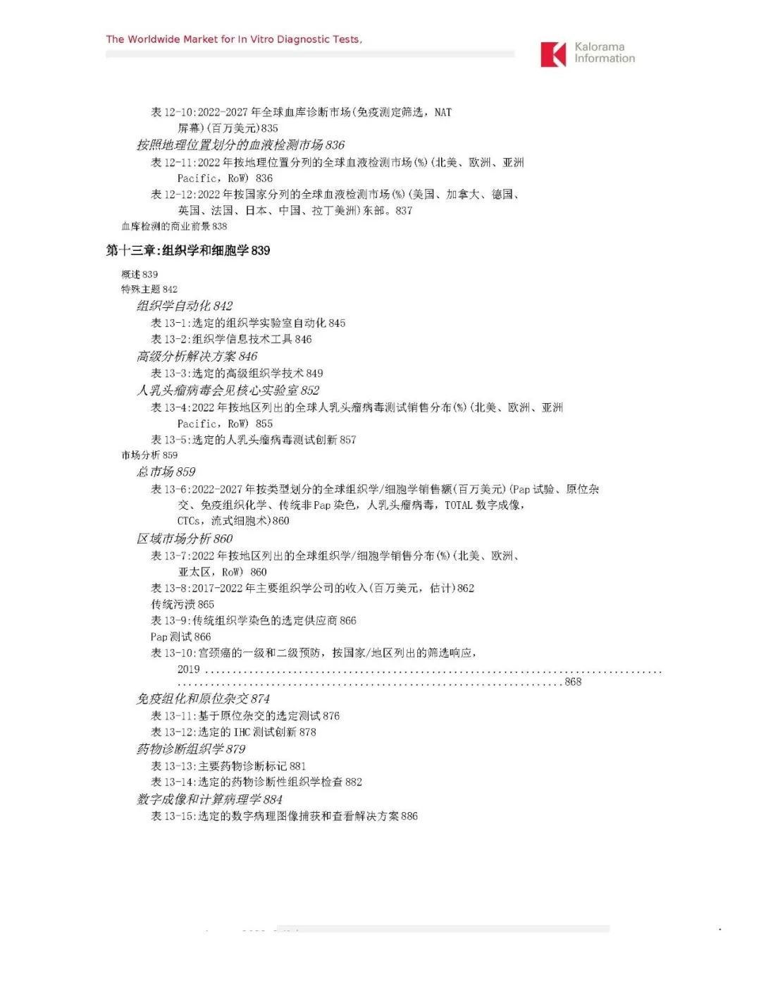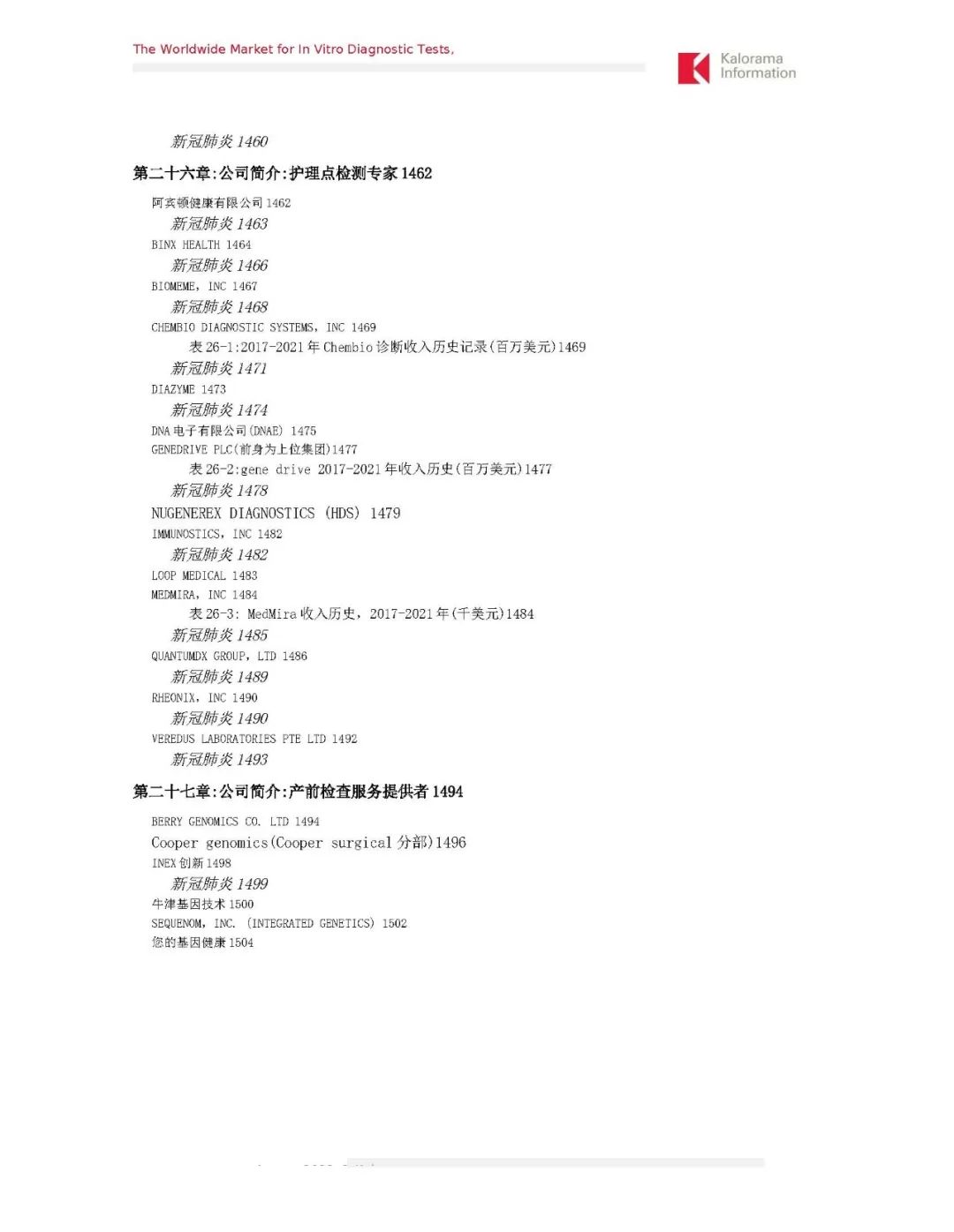 Kalorama Information在《全球IVD市场(第15版)》报告提供全球IVD (体外诊断) 检验市场相关调查,市场概要,各市场区隔/细分区隔的市场规模与预测,及主要各地区/国家的市场的分析与预测,以及各市场区隔的主要企业的简介等。 最近几年,体外诊断显然成为医疗健康产业与资本市场关注的重点,即使放在全球,体外诊断也是个极具潜力的风口行业,在精准医疗的风口之下,体外诊断行业迎来了非常好的发展时期,著名医疗保健市场调查公司Kalorama Information发布的报告《The World wide Market for In Vitro Diagnostic Tests,15th Edition》。 IVD市场亮点 以下是该报告的一些亮点: 从IVD市场的角度来看,新冠肺炎是长期存在的:自新冠肺炎登陆以来,已有近6亿人感染,600万人死亡。诊断市场的维持需要依赖疾病的威胁来进行测试销售。根据任何流行病学和市场计算,新冠肺炎将是一个健康问题,足以保证在整个五年预测期内进行检测,这是卡洛拉马目前的评估。2022年,对新冠肺炎的测试预计将为市场增加近330亿美元。 整合趋势加强:新冠肺炎加强而不是打破了IVD公司的整合趋势。有人认为情况可能相反,疫情带来了许多新的小公司。然而,较大的公司拥有更强的分销和生产能力,以及实验室的信誉。整合继续并得到加强,因为大型ivd具备疫情水平测试所需的能力。2022年,IVD顶级公司的IVD产品销售额约为1,010亿美元,而2021年为970亿美元,2020年为750亿美元,2019年为610亿美元,2018年为580亿美元,2017年为250亿美元,2016年为470亿美元。这表明2016-2022年顶级收入增长了约13.7%。 癌症检测的高增长率:与癌症检测相关的细分市场属于增长更快的收入细分市场:原位杂交、分子癌症标志物、免疫组织化学、人乳头瘤病毒分子检测。 除癌症外,增长明显的细分市场包括:滥用药物免疫测定、心脏标志物、FOB、Hba1c关注点检测和连续血糖将显示出高于市场的增长率。器官移植的遗传测试和分子测试也是市场高度增长的领域。 雅培诊断公司引领IVD市场:这标志着全球体外诊断市场头部公司的领导地位发生了变化。在我们的上一版中,罗氏和雅培并列市场领先地位。现在雅培领先了。原因是什么?雅培在快速诊断的地位源于其对Alere的收购、新冠肺炎疫情以及持续存在的检测市场。血糖检测销售也有所贡献。 这可能是暂时的领导层变动:罗氏的业务在COVID测试和非COVID测试市场都保持了实力和稳定性。罗氏的分子检测业务在与制药公司合作开发伴随检测方面具有未来的潜力。 增长将来自新兴市场销售:新冠肺炎迫使美国暂时扩大在IVD 市场的份额。2022年的形势恢复到2019年的状态,大多数IVD测试类别和美国以外的市场都将寻求增长。越南、土耳其、韩国、阿联酋、沙特阿拉伯、中国和拉丁美洲是主要的新兴市场选择。 质谱继续成为市场的重要组成部分,不仅仅是微生物领域。Kalorama估计,到2027年,质谱市场将达到16亿美元。糖尿病和维生素C是将进入该市场的细分市场之一。AB Sciex引入了HbA1c检测,该公司还提供维生素d的质量规格试剂盒。Newomics Inc .因其Sciex 质量规格系统上的25-OH-维生素D2/D3的IVD-MS试剂盒获得CE认证。脂肪科学正在开发一种用于HgA1c的硅微流控芯片LC-MS。其他测试必然也会随之而来;请继续关注。第7章免疫测定中更详细地讨论了质谱在诊断中的作用! |