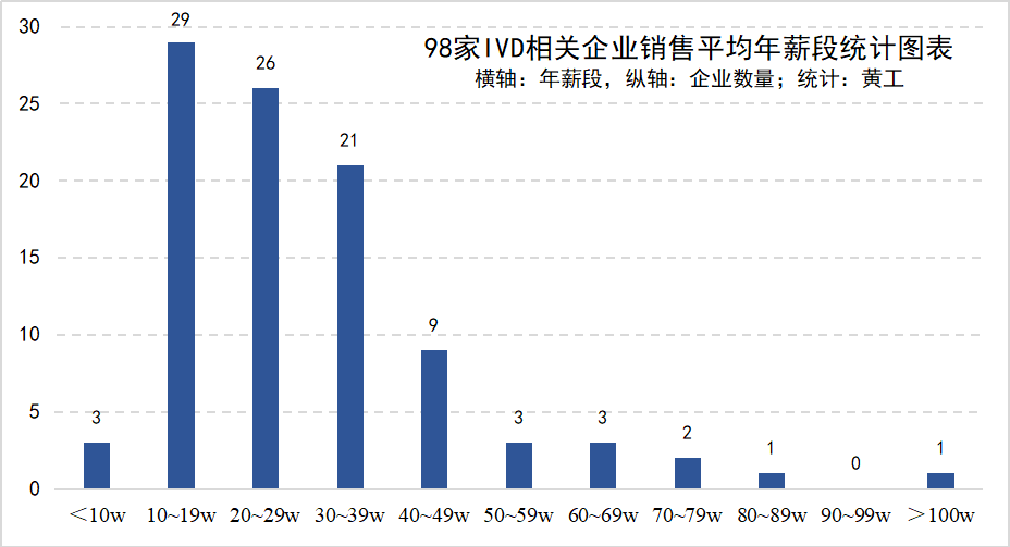 先看看总体情况。98家IVD相关企业,员工总数18.04万人,销售总数4.48万人,平均来看销售团队占公司总数的四分之一,给销售团队发了157.9亿薪酬。 销售平均年薪,70w以上的有4家。最高的,是达安基因,高达109w,难以想象啊。达安的数据,核实了几遍,确认无误。其次是,之江生物,80.15w;亚辉龙,71.54w;迈瑞医疗70.63w。这的确,比一些董事长和总经理的年薪,都要高出不少。销售平均年薪,10w以下的,有3家。亚森实业,6.19w;奥迪康,8.51w;璟泓科技,8.9w。来看一下,年薪段的统计。最多的,还是处于10~39w这三个段位。总共有76家,占近8成。这,总体反映了IVD行业销售的平均年薪情况,八二定律嘛。 即销售团队占公司员工总数的比例,或销售单元占公司总体比例。销售团队,占40%以上的,有11家。最高者,是主营原料的优宁维,达到57.7%,近6成了,可谓是全员营销啊。原料行业,客户小而散,大多数购买都是小量多次。这个销售规律,和消费行业类似。所以,优宁维的销售模式,也和消费行业类似,核心是电商模式。建立自己的网络商城,通过电商、公众号等建立销售平台,可实时查看几万种原料并直接下单。其次是,璟泓科技56.82%,景川诊断50%,太和华美48.48%,合富中国47.88%,华科泰44.52%,科域生物43.52%,九强生物43.42%,伊普诺康42%,浩欧博40.57%,理邦仪器40%。这么看,好像还是新三板的企业,销售团队规模要大一些哦。低于10%的,是鑫乐医疗,做耗材的,只有8.55%的销售团队,生产团队人数非常多,577人,占76%!其次是,东方生物8.27%,出口导向型企业。拱东医疗,竟只有不到4%的销售团队,也是令人惊讶,主体是生产团队,1230人,占近7成。看来耗材企业,主要的还是生产人员,在车间生产加工的,学历以大专以下为主。从绝对人数来看,上3千人的销售团队,只有3家。最多的是迈瑞医疗,4071人,占25.29%;其次是,乐普医疗3409人,占32%;金域医学3047人,占21.14%。上1千人的销售团队,还有迪安诊断2832人,新华医疗2085人,安图生物2017人,丽珠集团1819人,三诺生物1355人,诺唯赞1288人,理邦仪器1085人,圣湘生物1020人,华大基因1008人。 不超10人的销售团队,有5家。玛诺生物,4人;科立森,5人;亚森实业,6人;达晖生物,7人;珈诚生物,8人。