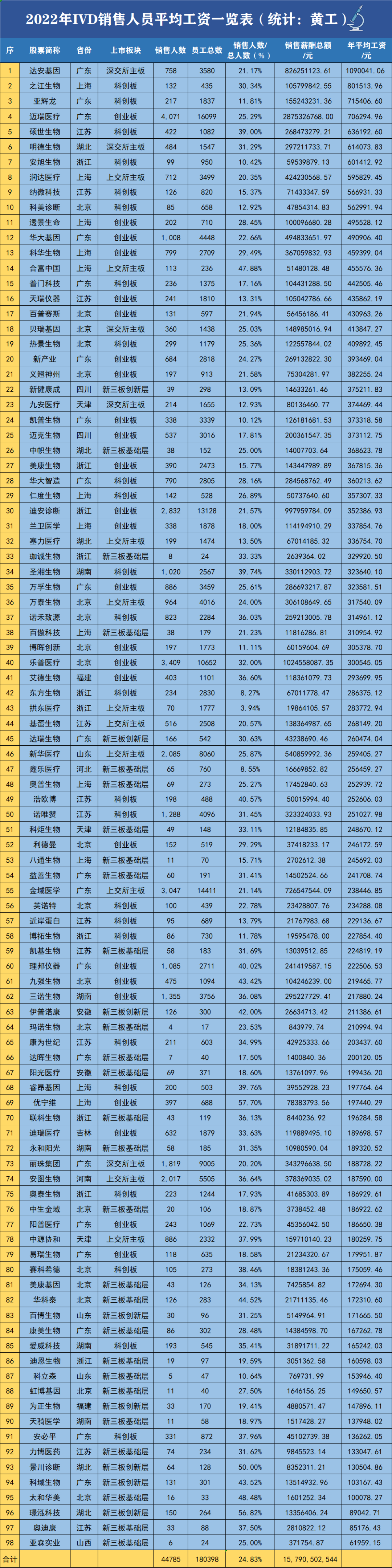 销售,和采购一样,是一个离钱很近的职位。企业所有经营活动,目标都是通过销售这一动作,实现产品变现。销售团队规模大小、销售能力强弱,决定了企业研发的产品或服务,能否卖出去、卖多少。而销售团队,最基本、最直接、最有效的激励,就是薪酬。当然精神激励也是有必要的。按照会计准则,短期职工薪酬,即指一个自然年内,员工凭劳动获得的现金收入。包括6个基本项目:①工资、奖金、津贴和补贴;②职工福利费;③社会保险费(医疗保险费+工伤保险费+生育保险费);④住房公积金;⑤工会经费;⑥职工教育经费。所以,本文及上一篇研发平均薪酬,都包括这6项收入。工资卡显示的,主要是①,其余五项,都存社保卡或日常发放了。以下,是98家A股上市和挂牌,IVD相关企业的销售团队人数、销售薪酬总额、销售平均年薪统计表,不包括港股、美股的企业。大家来看看,自个在什么位置上?在业内是什么位置?