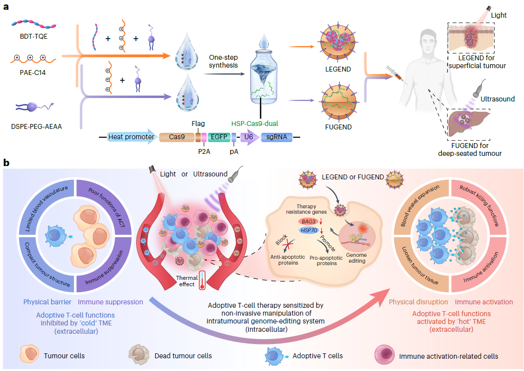 针对实体肿瘤的过继T细胞治疗受到肿瘤细胞凋亡抵抗机制和细胞外免疫抑制肿瘤微环境的限制。基因科技网讯:2023年5月15日,浙江大学平渊和中国科学院过程工程研究所魏炜团队合作在Nature Nanotechnology(IF=41)在线发表了题为“Non-invasive activation of intratumoural gene editing for improved adoptive T-cell therapy in solid tumours”的研究论文,该研究报告了一种温度敏感的基因组编辑纳米装置,它可以提供一个带有外部触发器的Cas9编辑器,可用于编辑肿瘤细胞的基因组,以减少对凋亡的抵抗,并通过温和的加热触发器调节肿瘤微环境。在局部或全身递送Cas9后,通过非侵入性近红外(NIR)光或聚焦超声(FUS)诱导轻度加热来激活Cas9,从而启动肿瘤细胞中HSP70 (HSPA1A)和BAG3的同步基因组编辑。这破坏了肿瘤细胞对过继T细胞的凋亡抵抗机制。NIR或FUS诱导的轻度热效应通过破坏物理屏障和免疫抑制来重塑细胞外肿瘤微环境。这促进了过继T细胞的浸润,增强了它们的治疗活性。在模拟一系列临床适应症的不同小鼠肿瘤模型中,包括基于人源化患者异种移植物的肿瘤模型中,已经证明了温和的热Cas9递送。因此,该研究表明无创热传递Cas9可显著提高肿瘤浸润淋巴细胞和嵌合抗原受体T的治疗效果,具有临床应用潜力。另外,2022年9月14日,浙江大学刘祥瑞,平渊及周天华共同通讯在Science Advances 在线发表题为“Exosome-mediated delivery of Cas9 ribonucleoprotein complexes for tissue-specific gene therapy of liver diseases”的研究论文,该研究报告了一种以前未知的基因组编辑递送系统,名为 ExosomeRNP,其中 Cas9 RNP 通过电穿孔被加载到从肝星状细胞中分离出来的纯化外泌体中。 ExosomeRNP 促进了 RNP 在体外的有效胞质递送,同时在体内特异性地积累在肝组织中。ExosomeRNP 在急性肝损伤、慢性肝纤维化和肝细胞癌小鼠模型中显示出强大的治疗潜力通过分别靶向 p53 上调的凋亡调节剂 (PUMA)、细胞周期蛋白 E1 (CcnE1) 和 K(赖氨酸)乙酰转移酶 5 (KAT5)。总之,该研究开发的ExosomeRNP为肝脏疾病的精确和组织特异性基因治疗提供了一个可行的平台(点击阅读)。过继性细胞转移(ACT)治疗实体肿瘤的效果经常受到肿瘤微环境(TME)提出的物理和免疫障碍的影响,这些障碍会损害过继性T细胞浸润、靶向和杀死肿瘤细胞的能力。首先,具有异常血流特征的肿瘤血管失调以粘附分子表达下调为特征,从而限制了T细胞从内皮向肿瘤外渗。其次,从内皮细胞进入肿瘤的T细胞遇到实体瘤致密的细胞外基质,限制了过继T细胞在瘤内的深度浸润。除了上述物理屏障外,大量的免疫抑制细胞和免疫抑制细胞因子也极大地抑制了浸润的过继T细胞的抗肿瘤功能和增殖。尽管已经做出了许多努力来重塑细胞外TME以解决物理和免疫障碍,但肿瘤细胞中抗凋亡蛋白稳定的对T细胞诱导的细胞毒性的抵抗也极大地损害了肿瘤细胞对过继T细胞的敏感性。在机制上,T细胞通过穿孔素介导的途径在肿瘤细胞的膜上形成孔,然后启动颗粒酶B (GZMB)依赖性的细胞内凋亡,从而独特地诱导细胞死亡。然而,这种细胞死亡途径经常被上调抗凋亡蛋白所破坏,以停止由T细胞启动的细胞死亡信号,从而损害T细胞的抗肿瘤能力。考虑到这些挑战,该研究提出了一种非侵入性策略来操纵肿瘤细胞的细胞内和细胞外调节的肿瘤内基因组编辑,这可以大大提高实体肿瘤对过继T细胞的敏感性。先前的一些研究表明,HSP70 (HSPA1A)和BAG3在各种癌症类型中高表达,它们的细胞内活性对癌细胞的存活至关重要。最近的研究结果表明,HSP70和BAG3也可以调节TME以促进癌症的进展和对治疗的耐药性,包括T细胞介导的细胞毒性和癌细胞的化疗。此外,该研究的生物信息学分析显示,在不同类型的癌症患者中,高水平的HSP70和BAG3与较差的生存率呈正相关,并且这两个指标与抗凋亡BCL2家族表达密切相关。 纳米颗粒制备和治疗肿瘤机理示意图(图源自Nature Nanotechnology )基于上述证据,该研究首先开发了一种纳米器件,用于在体内通过非侵入性近红外(NIR)光或聚焦超声(FUS)激活热诱导CRISPR-Cas9系统,靶向HSP70和BAG3。在给药和细胞内递送后,由近红外光照射或FUS诱导的轻度热效应不仅触发双基因组编辑以破坏肿瘤细胞的凋亡抵抗机制,而且通过打破物理屏障和免疫抑制重塑细胞外TME。通过以上两方面的协同作用,该研究验证了这种基因组编辑策略使癌细胞对两种过继T细胞,即肿瘤浸润淋巴细胞(TIL)和嵌合抗原受体T细胞(CAR-T细胞)具有极大的敏感性,并对多种肿瘤模型表现出协同治疗作用。原文链接:https://www.nature.com/articles/s41565-023-01378-3
