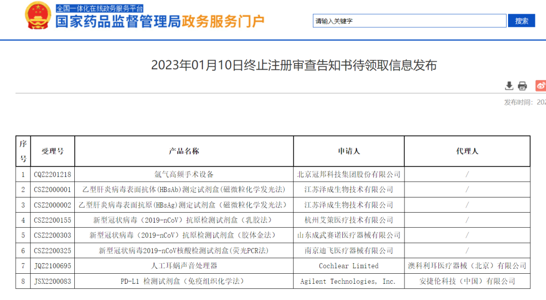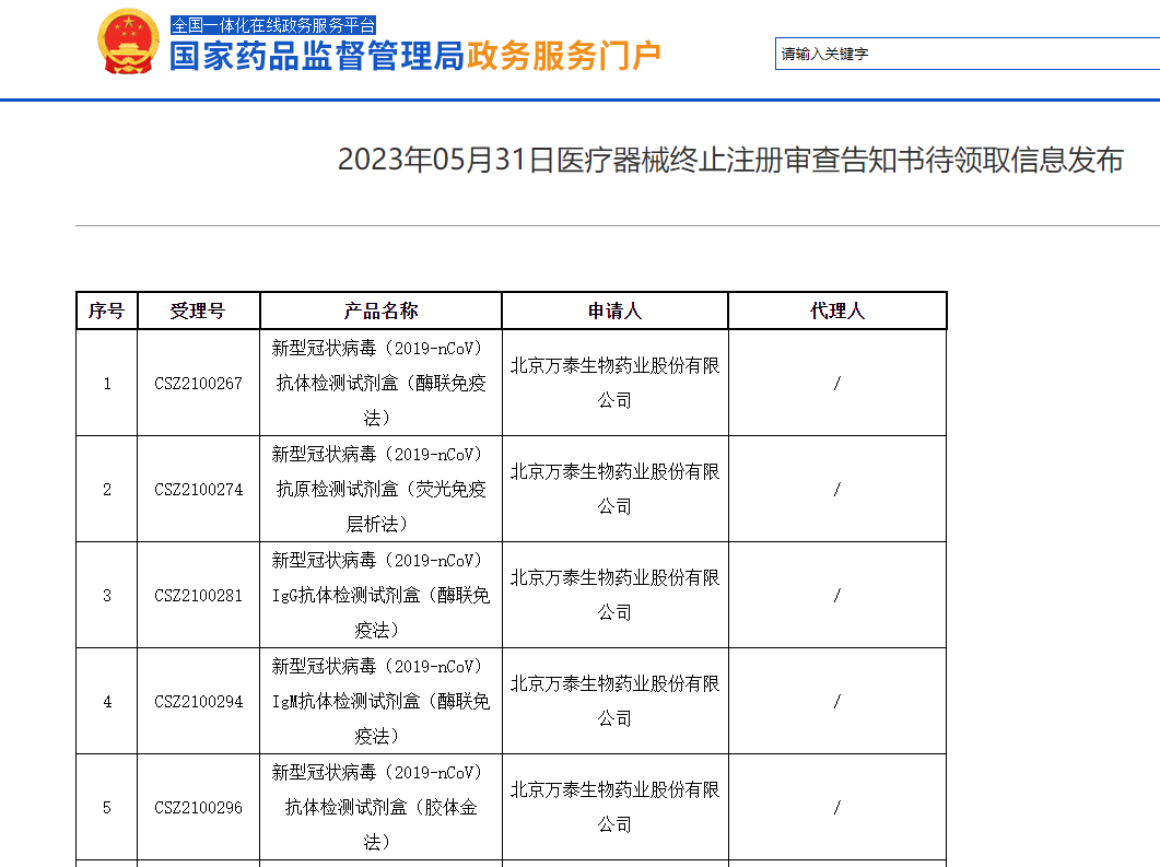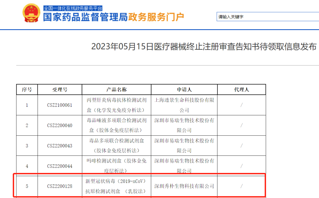 根据国家药监局网站披露,近期又有多款新冠抗原试剂盒终止注册、不予注册。名单如下: