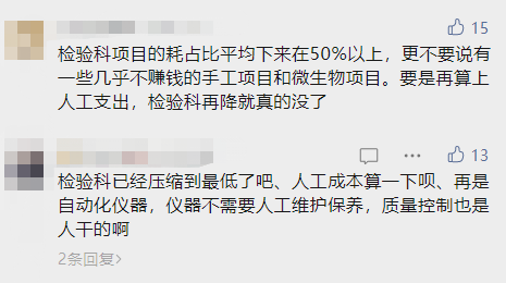 5 月 26 日,四川省医疗保障局发布《关于印发省管公立医疗机构医疗服务价格调整方案的通知(征求意见稿)》,公示时间为 2023 年 5 月 26 日至 2023 年 6 月 24 日。在《价格调整方案》后的附件中,包括了 18 项医疗服务价格拟调减项目及 440 项价格拟调增项目。其中,在价格拟调增项目里包括了如静脉采血、血气分析等多项检验检查项目。众所周知,检验人的收入分为工资与绩效奖金两部分。其中工资是依据医院级别、职称、工龄等因素,按国家统一规定的标准来发放;而绩效奖金,顾名思义,与能效相关。医院绩效奖金的一次分配主要有收支结余和工作量两种体系。作为辅助科室,检验科本身绩效就相对较低的主要原因,就包括了医疗服务项目有限、收费价格偏低等。由此可见,检验检查项目收费的调整与检验科绩效的高低密切相关,自然也会影响到检验人的收入。因此四川省省管公立医疗机构部分检验检查项目收费一经上调,检验人的收入也极有可能随之增加。值得一提的是,早在 2022 年 7 月,四川省卫健委就曾发布《中共四川省卫生健康委员会党组关于省委第一巡视组巡视反馈意见整改阶段进展情况的通报》,《通报》中为「有效控制医疗费用增长」而明确了,「每百元医疗收入(不含药品收入)中消耗卫生材料费」和「医学检验检查收入占比」指标均不再纳入考核范围。对应考核指标也调整为「公立医院百元医疗收入的医疗支出(不含药品收入)」和「医疗服务收入(不含药品、耗材、检查、化验收入)占公立医院医疗收入的比例」。所谓「每百元医疗收入(不含药品收入)中消耗卫生材料费」和「医学检验检查收入占比」也被称为「耗占比」和「检占比」。一般来说,医疗费用主要由三大部分组成:检查费用、药品费用、治疗费用。其对应的考核指标分别是「检占比」「药占比」和「耗占比」。但与此同时,《通报》还明确了要加大通报力度,每季度对全省及各(州)公立医院百元医疗收入(不含药品收入)中消耗的卫生材料费、医学检验检查收入占比进行通报,并持续加大不合理卫生耗材、不合理检验检查通报查处力度,以及不断加大四川省医疗服务价格调整力度,提升医疗技术服务占比。2023 年 5 月 19 日,江西医保局发出通知,对《肝功生化类检测试剂省际联盟集中带量采购中选结果》进行公布,至此,由江西医保局牵头的 23 省肝功类生化检测试剂联盟带量采购工作中选阶段终于落地。在今年 3 月,全国医药集中采购和价格管理工作座谈会上,江西省医保局党组成员、副局长何桑就曾提出,同步开展试剂检测医疗服务价格专项调价工作,巩固肝功生化类检测试剂集采降价成果。从广东牵头新冠试剂集采、江西牵头肝功生化试剂集采,再到安徽牵头化学发光试剂集采,全国各地推广各类检验试剂集采似乎已成为大势所趋。而集采之后,自然就是检验项目的调价了。当下,集采后的检验项目调价模式主要有两种,一是项目价格直接下调,另外一种则是「技耗分离」。对于项目总价下调的方式,并不是简单的做减法,在《国家医疗保障局办公室关于进一步做好医疗服务价格管理工作的通知》中明确,价格调整触发机制与药品耗材集中采购不直接挂钩,调整总量不直接平移置换。而对于「技耗分离」,目前河南省正在进行试点。但很显然,面对不同检验项目「技术收费」,主要通过检测方法确定这样的情况下,各级实验室都会更偏向使用附加价值更高的检测方法,比如化学发光。面对这一趋势,有检验人认为「技耗分离」更能体现检验技术和人员的价值,建议完善推广: 但也有人认为,不管是项目价格直接下调还是「技耗分离」,都还是会导至检验人的收入降低:
