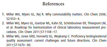 互换性是参考物质的性质,参考物质被检测的值,与具有代表性的临床样品被检测的值,在相同被测量的检测程序的2个或更多个之间,具有相同的关系(1,2)。当某个参考物质将被用于临床实验室检测程序的通用校准品,或将被用于质量评估(能力比对试验)计划去评价检测程序间检测病人样品结果的一致性时,要求互换性(3)。当参考物质被用于某个体外诊断厂商,作为他们内部溯源性程序,为他们的产品校准品定值时,也被要求互换性。 本期杂志上,Zegers等报告了新参考物质对铜蓝蛋白互换性的研究和证实,ERM-DA472/IFCC是被制备替代ERM-DA470的。早期的参考物质以血清为基础,是15个蛋白包括铜蓝蛋白的参考物质,没有被确认互换性,但有报告改善了常规临床实验室检测程序间对数种蛋白的一致性。但是ERM-DA470没有使得病人样品中的铜蓝蛋白结果一致性(harmonization),因它缺少互换性。常规程序结果间缺少一致性,被英国的国家室间质量评估计划(the United Kingdom National External Quality Assessment Scheme)证实,该计划使用了可互换的样品评估性能。Zegers等的报告强调了证实打算用于常规检测程序的通用校准品的参考物质,须确认互换性;参考物质提供者承担去评价互换性作为确认某个参考物质互换性的责任。 检验医学专业已经认识到在预期用作溯源性链的校准品中,参考物质互换性的重要性(1,2)。ISO 17511实施了为校准品和控制品定值在计量上的溯源性,并声明在溯源性链上的每一步,校准品的互换性。校准可溯源至较高等级参考物质或参考检测程序的目的,是为了使检测相同被测量的不同常规临床实验室检测程序对病人样品提供等同的结果。不幸的是,ISO标准对于病人样品的最后结果溯源性要求很模糊。Consequently因此,常规检测程序的产品校准品可溯源至无互换性的参考物质叙述的情况,造成不同常规程序间病人样品缺少一致性(4,7-13)。ISO 17511近期正在修订,我们期望(鼓励)工作组为确保在不同常规检测程序间病人样品结果具有可比性,要仔细地实施必要的溯源性要求。 所有参考物质的提供者,无论是预期作为通用校准品、还是去评估室间质量评估/能力比对试验的结果一致性,必须负责确保该物质与有代表性的临床病人样品是互换的。从实用观点,不可能去评价整个世界上使用的每个检测程序的互换性。合适的方式是对给定的被测量通常使用的程序和技术评价它们的互换性。近期CLSI对可互换参考物质的特性和量化的导则,对支持参考物质生产者以相应确认这一的物质是可用的(14)。发展(形成)不常用的检测程序,包括由实验室发展的项目和进入市场新程序,有责任确定某个给定参考物质是否适合用于这样的程序。对于这样的评估orient定向特定方案,需要由临床实验室社团去形成。 可互换的参考物质有很大的挑战,因为某个给定的分析物的分子形式会尚未很好地理解、或在不同的临床情况下有变异,而某个生物标志物被用于诊断或药物监视的信息。另外,为制备某个参考物质,也会难以得到内含被测量的相应分子形式的生物物质合适量。还有困难是临床样品处理中分子形式被修饰(修改)、对需要的生物标志物的纯化、在制备物质或添加稳定剂时改变了通常的样品基质等。某个生物标志物的纯化形式会不合适去制备用于常规检测程序的以合适基质为基础的物质。例如,基因重组蛋白会可用、但会不具有相应转译后的糖基化、或分子复合物结构,可合适地代表未经改变的临床被测量。除此之外,互换性依然是参考物质的基础要求,因为它将用于校准溯源性过程或评价室间质量评估计划中检测程序间的一致性。 在检验医学中有几个新的发展,在未来的岁月里将对改善检测程序的一致性有关系。WHO近期召集了咨询:WHO生物参考制品在体外检出感染标志物的互换性。该会议预期将在不久公布于WHO网页。尽管这个会议关注的仅是感染疾病的生物标志物,WHO也提供了其他临床实验室学科的“国际标准”和“参考试剂”等实质性的多个参考意见。许多常规检测程序具有校准可溯源至WHO参考物质的,还没有被评价过互换性,有些已经被报告没有实现病人样品结果间的一致性(7-11)。我们称赞WHO认识到参考物质互换性的重要性,以确保它们适应它们的预期用途,和我们期望在未来进行互换性的评价,并更新它们参考物质。 JCTLM列出了参考物质、参考检测程序、和实施参考程序的实验室,已经被评审是否与ISO标准一致、可以用于建立常规临床实验室检测程序的校准溯源性。工作组1的质量手册已经添加了要求,包括参考物质互换性的评估,被考虑列出数据库 (15)。 IFCC科学部近期建立一个互换性的工作组。该工作组正在负责未来形成互换性正规评估的程序,和依据某个被测量的预期临床用途,规定某个参考物质是可互换的的指标。诸如confounding扰乱影响检测特异性、参考物质批号置换的评价、和以新的检测程序对现有的物质互换性的评估等问题,是这个工作组要实施的内容。 AACC已经在导至形成国际临床实验室结果一致性共同体(International Consortium for Hamonization of Clinical Laboratory Results)。这个新计划在2010年的国际forum讨论会上被证实由这个需求,去组织全球的努力推动一致性结果(2)。该计划目的在于提供为依据临床重要性和使用于临床实践导则中对一致性需求,证实和优先考虑的被测量的中心
