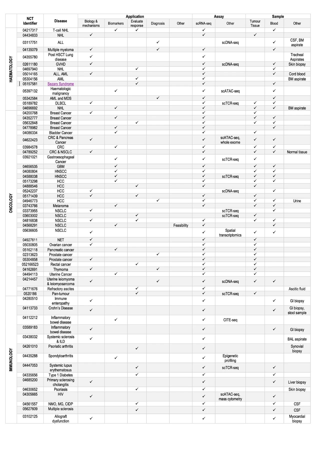 单细胞基因组学是将高通量测序技术应用于单个细胞。自 2009 年第一篇单细胞测序论文发表以来,单细胞技术的进步飞速,得益于能够同时进行数万个细胞并行生成高精度数据的产品的开发和商业化。 现在有大量的单细胞实验方法用于检测不同的基因组及转录组特征,包括 DNA 甲基化、染色质可及性和其他表观遗传标记。随着单细胞 RNA 测序 (scRNA-seq) 和单细胞 DNA 测序 (scDNA-seq)等方法越来越普及,大家普遍的关注点转向为:这些何时能用于临床转化? 基因测序应用于临床的最典型场景就是开发基因组信息指导的诊断。这通常涉及从患者的大量组织样本中生成 DNA 或 RNA 序列信息,并对其进行分析以确定可用于诊断、预测或告知临床管理的特定信息。术语“批量bulk”是指从大量细胞共同生成基因组数据的方法,或者从源自许多细胞的cfDNA中生成基因组数据的方法。因此,过去的精准医学代表大量细胞的平均信号。 尽管批量的基因诊断方法已经在进入临床实践,但批量分析无法揭示细胞之间的基因组差异。这一点又很关键,因为大多数系统在细胞之间具有显着的基因组异质性。细胞异质性的例子有很多,包括由肿瘤体细胞突变引起的克隆多样性、肿瘤浸润免疫细胞之间的基因组变异、T 和 B 细胞的不同克隆性群体等。这些导至了千差万别的临床特征和不同结局,包括诊断率低、治疗效果不一、长期预后差等等。 已经有诸多的单细胞基因组研究表征并阐述了临床相关的细胞异质性,以及这些如何被利用来改善临床实践。理论上讲,毫无疑问,同时确定数千个单个细胞的基因组图谱在临床应用上具有无限开发潜力。 截至去年底,已经有 62 项使用单细胞基因组学方法的肿瘤学、血液学和免疫学注册临床试验中应用。这些试验中的大多数都具有探索性目标,例如发现与标准治疗试验一起使用的生物标志物或改进疾病的诊断和亚分类。尽管探索性研究仍然至关重要,但明确关注scRNA-seq的实际应用及其在诊断环境中使用的可行性的试验无疑将最有可能推动其在临床实践中的应用。 有趣的是,目前大多数试验使用 scRNA-seq 或 scRNA-seq + scDNA-seq的组合,这可能反映了技术的成熟度,特别是在肿瘤学和血液学中。值得注意的是,这些临床试验中的大多数 (85%) 是使用血细胞进行的,或者在实体瘤中使用血液和肿瘤细胞的配对样本进行。这部分原因是实体组织分离仍然存在挑战,尽管使用配对样本将使验证研究能够减少对实体组织活检的要求。 评估单细胞测序辅助诊断和识别可靶向突变以推动治疗决策的能力的临床试验对于将其转化为临床实践至关重要。这可能将逐渐成为临床试验设计的一个固有组成部分。