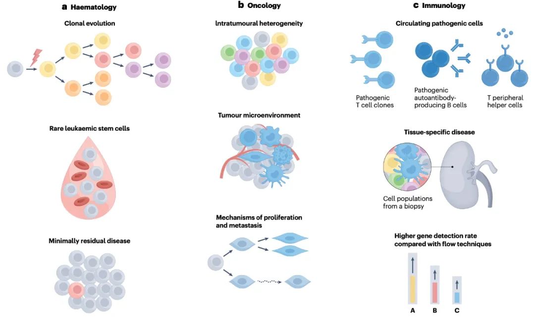 随着研究结果的不断出现,单细胞分辨率的基因组测序逐渐加深了我们对血液学和实体器官恶性肿瘤的理解。它绘制出肿瘤异质性和微环境,确定联合治疗的多个靶点,预测对治疗的反应和毒性,并深入了解治疗耐药的机制。单细胞测序在开发自身免疫性疾病的精准治疗以及患者分层、疾病监测和准确诊断方面显示出希望。
