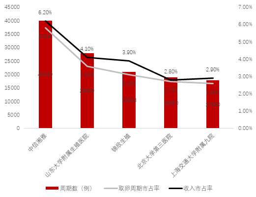 来源:国家卫计委、高禾投资研究中心 四、 辅助生殖行业发展趋势分析(一) 与商业保险合作将会成为机构的发展方向商业保险帮助患者缓解由于辅助生殖失败带来的经济压力。我国生育专家表示,辅助生殖周期数量将随女性年龄增加而增加,35岁以下女性做超过1次周期以上的比例为43%,35-39岁的女性对应比例达到61%,40-42岁的女性对应比例达到74%。人工授精单周期平均价格约为0.5万元,IVF单周期平均价格约为3.5万元,IVF较人工授精治疗更普遍,按照2次周期来算,费用达到7万,价格昂贵且存在失败的风险。泰康保险在2017年率先推出全国首款试管婴儿保险,锦欣生殖的旗下医院也与商业保险公司合作推出保险产品。目前我国并未设置辅助生殖医保,商业保险将会降低不孕夫妇的经济压力,间接减少心理压力,提高移植成功率,扩大辅助生殖行业需求,预计未来会有更多辅助生殖机构与商业保险公司展开合作。 (二) 拓展服务,延伸产业链,打造全方位发展辅助生殖中心产业链纵向延伸,全方位、一体化服务趋势逐渐加强。对于一般的妇产医院,其服务可覆盖为:产科——儿科/妇科——辅助生殖——月子中心。对辅助生殖中心而言,未来发展不仅局限于单一的辅助生殖服务,不仅可以向上扩展上游的辅助生殖试剂、耗材、设备供货商服务,也可以打通下游,提供月子中心服务,在患者妊娠成功后,向其提供月子服务,使患者享受一站式服务。月子中心可以提供包括产后修复、新生儿护理、母婴营养、美丽塑形等多样化服务。辅助生殖中心会全方位扩展业务领域,打造一体化发展的辅助生殖机构。 五、 辅助生殖行业竞争格局分析目前,国内的辅助生殖医疗机构有公立医院占据主导地位,行业内现有持牌辅助生殖服务机构的公立医院占90%,如北京大学第三医院、山东大学附属生殖医院等。非公立的辅助生殖机构包括中信湘雅生殖与遗传专科医院(中信湘雅)、锦欣生殖医疗集团和爱维艾夫医疗集团等。按照取卵周期计算市占率,2018年辅助生殖医院前10名的总市场份额为26%,前20名为36%,竞争格局高度分散,其中中信湘雅生殖与遗传专科医院占据5.8%的市场份额,排市场第一。高等级公立医院凭借强大的科研实力及优秀的医生团队具有较强竞争力,但覆盖区域和接收患者能力有限,市场整体供不应求。 图 2018年中国辅助生殖服务中心前五名