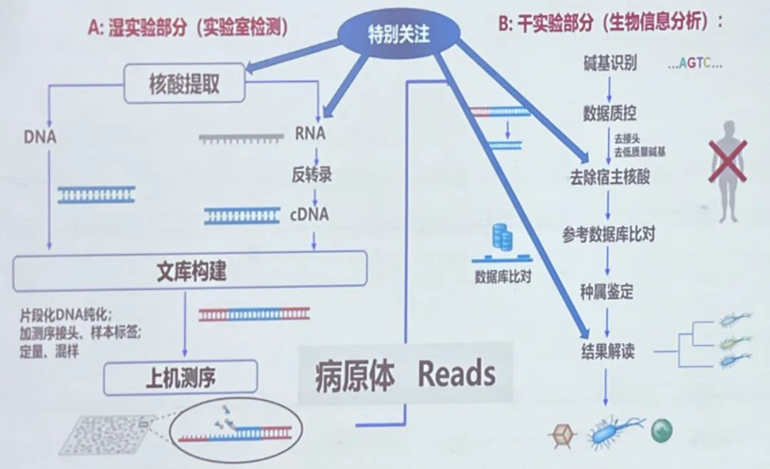 图 1. mNGS 实验流程 ① 标本不同,处理不同:血标本通常不做破壁处理,直接提取病原体 DNA,血液标本中人源背景的 DNA 过多,破壁会影响结果;
