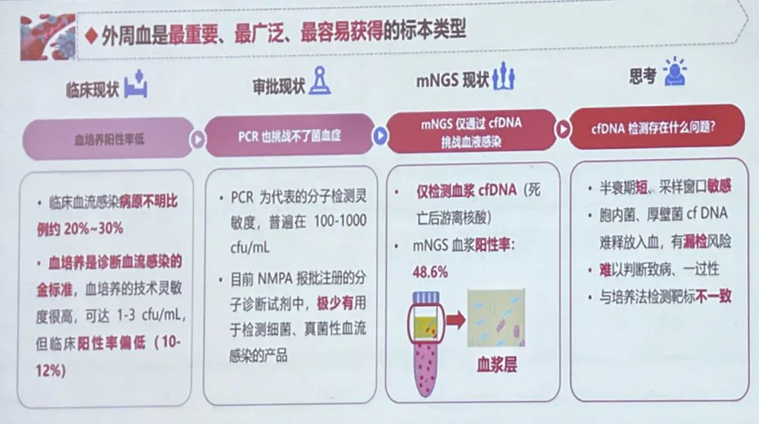 图 4. 血液感染分子检测现状传统的血液标本检测技术是分离血浆,不破壁,仅仅检测血浆中的游离 DNA(fDNA), 现有多种改进方法,改进方法 1:血液不离心,整体标本直接破壁,再行测序,以保证不易破壁和细胞内病原体的检出;改进方法 2:血液离心,分别做血浆和细胞层的 mNGS 检测,其中细胞层行破壁处理后进行检测。两种方法都可以提高检测的敏感性,但整体血液标本不离心检测亦可能损耗部分病原体而降低某些病原体的检出率。