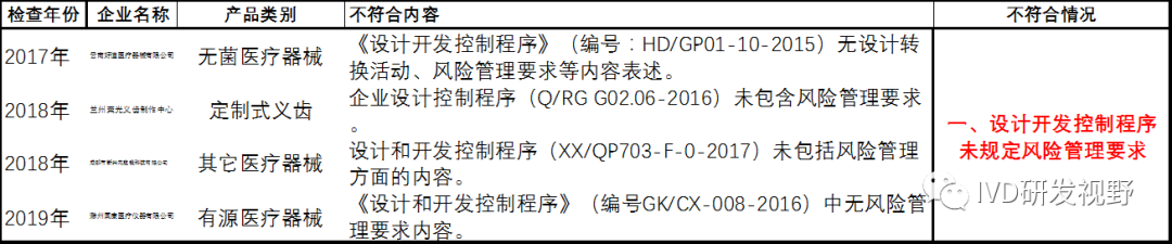 3.国家飞检不符合项风险管理相关的国家飞检不符合项主要集中在以下几方面:一、设计开发控制程序未规定风险管理要求;二、设计开发过程或设计变更未进行风险分析、评价、控制;三、生产检验过程存在污染风险或是质量风险,但未进行风险分析和控制;四、未进行产品上市后的不良事件风险评价或定期风险评价;五、风险管理文件和记录缺失或不符合规定要求。其中设计变更未进行风险分析和生产检验过程存在质量风险两种情况不符合项最多。 一、设计开发控制程序未规定风险管理要求