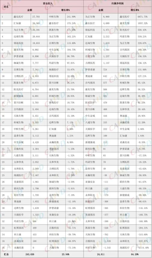 注:以下表格包括主板、中小板、创业板和科创板体外诊断相关上市公司