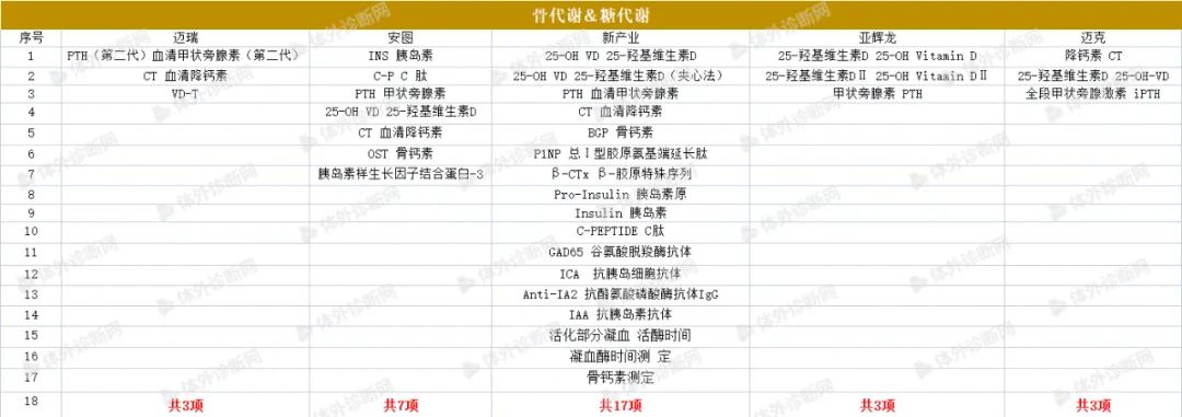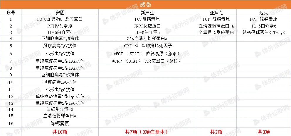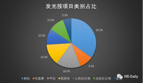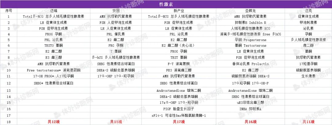 肿瘤标志物新产业获证最多,为29项(1项注册中) 性激素新产业获证最多,为17项 甲功新产业获证最多,为14项 贫血新产业、亚辉龙获证最多,为5项 骨代谢&糖代谢新产业获证最多,为17项 感染安图获证最多,为16项 心肌标志物新产业获证最多,为16项 传染性疾病安图获证最多,为17项 自身抗体亚辉龙获证最多,为44项 整体来看,化学发光九大项目中,新产业获证项目数量位居榜首,为150项(15项注册中)。如有遗漏,欢迎留言,我们将随时进行补充! 化学发光免疫分析技术是将具有高灵敏度的化学发光测定技术与高特异性的免疫反应相结合,用于各种抗原、半抗原、抗体、激素、酶、脂肪酸、维生素和药物等的检测分析技术。是继放免分析、酶免分析、荧光免疫分析和时间分辨荧光免疫分析之后发展起来的一项最新免疫测定技术,具有灵敏度高、检测快速、试剂稳定无生物毒性、易全自动等特点,成为免疫分析技术中最具发展前景的发光之一,在许多疾病的临床诊断中具有重大意义。 化学发光免疫分析法以标记方法的不同而分为两种: (1)化学发光标记免疫分析法 (2)酶标记、以化学发光底物作信号试剂的化学发光酶免疫分析法 国内发光大部分市场仍被进口品牌占据,《医药器械蓝皮书》显示,罗氏、雅培、贝克曼以及西门子为代表的进口品牌占据超过80%的市场份额,罗氏在化学发光诊断市场的占有率最高,达到35.5%。 可见,国产品牌想要在这一领域实现超越可谓是困难重重,但更大的挑战也意味着更大的机会。 第一,国内化学发光领域并未出现具有绝对垄断优势的头部企业; 第二,随着中国体外诊断行业的蓬勃发展和国产替代化浪潮的兴起,国产品牌的市场认可度、产品性价比都在不断提高; 第三,化学发光诊断项目众多,每一个细分项目所占份额十分接近,处于快速发展阶段,对想要进入这一领域的企业来说,有很大的发展空间。 图源:IVD Daily 因此,研发能力、技术水平与性价比兼备的企业,仍可以在这条黄金赛道上找到一席之地。 目前国内已有超过200家生产厂家获得化学发光注册证,上百家IVD企业也竞相涌入化学发光领域,根据国内的市场需求及时调整产品策略,竞争异常激烈。其中,被誉为“化学发光五虎”的迈瑞、安图,新产业、亚辉龙,迈克表现出强劲的实力和竞争力。 如有遗漏,欢迎留言,我们将随时进行补充! 发光五虎在肿瘤标志物领域的获证情况呈现百花齐放态势,各家获证数量差距不大。 AFP、CEA、CA125、CA15-3、CA19-9、TPSA、FPSA、CA72-4、NSE、CYFRA 21-1、HE4、ProGRP、CA50、CA242基本各家都有;胃蛋白酶原ⅠPGⅠ、胃蛋白酶原ⅡPGⅡ、铁蛋白FERR目前迈瑞、安图、新产业、亚辉龙获证;PIVKA-Ⅱ 异常凝血酶原只有安图、新产业、迈克获证。 癌症一直是我国最大的民生健康问题之一。福建省医保局于去年年末带头将临床必需的肿瘤检测项目纳入医保,报销比例高达90%,体现了国家对肿瘤早筛的重视。在刚刚结束的上海肿瘤标志物大会上,与会专家也纷纷表示,肿瘤标志物技术目前虽然有了量的改变,但是仍任重而道远,早诊早筛仍有巨大发展空间。 未来,肿瘤标志物领域仍会是各大企业竞相争夺的化学发光市场,除了在“量”上的完善,更为重要的应该是“质”上的比拼了。 LH 促黄体生成素、PROG 孕酮、E2 雌二醇、AMH 抗缪勒氏管激素、人绒毛膜促性腺激素、泌乳素基本各家都有,在获证数量上,新产业、亚辉龙较多,分别为17项和16项,迈瑞12项,安图11项,迈克11项。 甲功方面,新产业获证最多,为14项。 FT4 游离甲状腺素、FT3 游离三碘甲状腺原氨酸、TG 甲状腺球蛋白、Anti-TG 抗甲状腺球蛋白抗体、Anti-TPO 抗甲状腺过氧化物酶抗体等常规标志物基本各家都有;PTH甲状旁腺素目前只有迈瑞、新产业获证。 贫血领域各家的铁蛋白试剂均获证,整体数量较少。 代谢领域,新产业发力最为强劲,获证项目有17项,骨代谢与糖代谢基本持平。 安图在感染领域获证数量最多,为16项。PCT降钙素原最受企业青睐。 心标市场向来是IVD企业竞相争夺的领地。新冠疫情发生以来,多项研究证实心肌损伤标志物的升高广泛存在于COVID-19感染者中,为迅速占领市场高地,把握后疫情红利,发光五虎对心肌标志物也是极为重视。 目前来看,新产业在心肌标志物领域一骑绝尘,获证项目有16项,其余四家在获证数量上差距不大。 传染性疾病一直是全球面临的最严重的公共卫生问题之一。在该领域,安图项目最多,为17项(新产业18项,但有7项为注册中)。结核感染目前只有安图和迈克获证。 除了各家争相竞逐的第一大领域——肿标,最为大火的应该就是自身抗体。目前亚辉龙在该领域有44项产品获证,新产业也不甘示弱,拥有27个项目(4项注册中),迈克、安图紧随其后。 当前,自身抗体的检测已经成为临床常规检测项目,据头豹研究院数据显示,自身抗体检测市场规模呈现逐年上升的态势,预计2023年市场规模可达22.3亿元人民币。这一前景巨大的蓝海市场正在吸引各IVD新老玩家加速入局,强势分羹。 图源:头豹研究院 今年两会期间,国家重点提到要强化基层卫生体系建设,部分地区已经响应号召加快推动县域医疗次中心建设,完善医疗设备配置,全自动化学发光仪器未来将会成为乡镇卫生院标配,这也是向IVD企业释放出的巨大信号,化学发光领域仍有巨大的市场缺口。 通观目前发光五小龙的化学发光试剂菜单,可以看到在品类