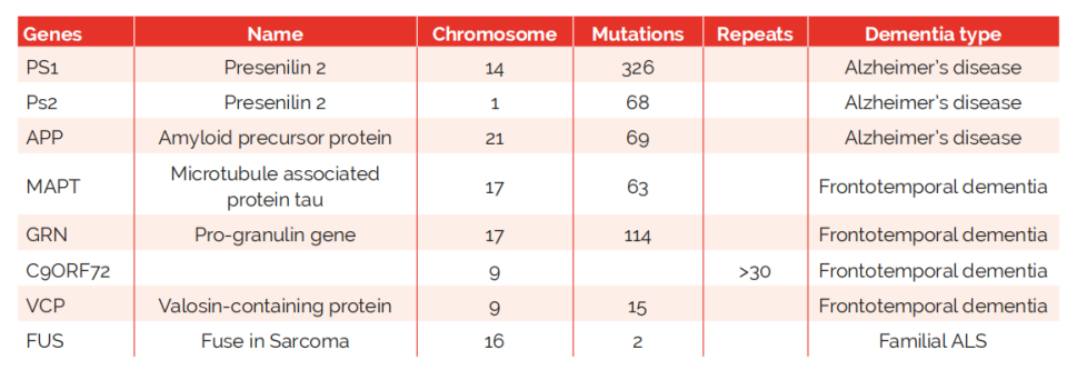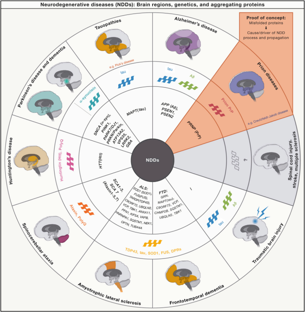 外环分别显示了ndd和受影响的脑区。它们各自的症状、受影响的大脑区域、相关基因和聚集蛋白以前已经被详细描述过。NDDs的特征聚集蛋白包括淀粉样前体蛋白(APP)(APP基因)、tau蛋白(MAPT基因)、共核蛋白(SNCA基因)、焦油dna结合蛋白43(TDP-43)(TARDBP基因)、超氧化物歧化酶(SOD1)(SOD1基因)、二肽重复蛋白(DPRs)(C9orf72基因)、FUSrna结合蛋白(FUS基因)、杭丁顿蛋白(PolyQ)(HTT基因)、多q蛋白(PolyQ)和细胞朊蛋白(PrPC)(PRNP基因)形成的Aß肽。与不同NDDs相关的因果基因和最高风险基因的非详尽列表。