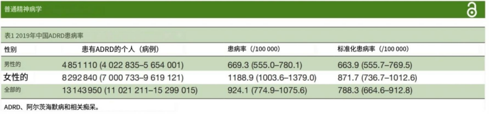 2019年ADRD的年龄标化发病率是788.3/100 000(664.6-912.8),并且存在一定的年龄差异。2019年ADRD的年龄标化死亡率是23.3/100 000(5.7-61.3),略高于全球水平。