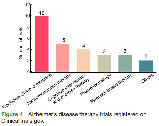 通过整理在ClinicalTrials进行的研究情况,发现在中国有97项已经完成或者正在进行的临床试验,其中41项是于2019年注册的(见图4和图5)。抗Aβ疗法、神经调节疗法、干细胞疗法和中医药是过去2年临床应用的主要方法。