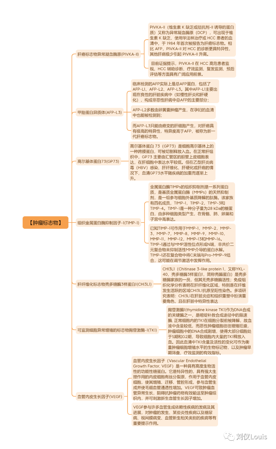 【肿瘤标志物】 肝癌标志物异常凝血酶原(PIVKA-II) PIVKA-II(维生素 K 缺乏或拮抗剂-II 诱导的蛋白质)又称为异常凝血酶原(DCP),可出现于维生素 K 缺乏、使用华法林治疗或 HCC 患者的血清中,于 1984 年首次被报告为肝癌标志物。相比 AFP,PIVKA-II 对 HCC 的诊断更具特异性,其他肝病极少引起 PIVKA-II 升高。 目前证据提示,PIVKA-II 在 HCC 高危患者监视、HCC 辅助诊断、疗效监测、复发监测、预后评估等方面具有广阔应用前景。 甲胎蛋白异质体(AFP-L3) 临床检测的AFP实际上是总AFP蛋白,包括了AFP-L1、AFP-L2、AFP-L3。其中AFP-L1主要出现在良性的肝脏疾病中(如慢性肝炎和肝硬化),构成非恶性肝病中总AFP的主要部分; AFP-L2多数由卵黄囊肿瘤产生,在孕妇的血清中也能被检测到; 而AFP-L3只能由癌变的肝细胞产生,对肝癌具有极高的特异性,特异度高于AFP,被称为新一代肝癌标志物。 高尔基体蛋白73(GP73) 高尔基体蛋白 73(GP73)是细胞高尔基体上的一种跨膜蛋白,可被切割释放入血。在正常肝组织中,GP73 主要由汇管区的胆管上皮细胞表达,在肝细胞中表达水平较低。但在乙型肝炎病毒(HBV)感染、肝纤维化、肝硬化或肝癌的情况下,血清GP73水平随疾病的加重而逐渐上升。 组织金属蛋白酶抑制因子-1(TIMP-1) 金属蛋白酶TIMPs的组织抑制剂是一系列蛋白质,是基质金属蛋白酶(MMPs)的天然抑制剂,是一组参与细胞外基质降解的肽酶。该家族有四名成员,TIMP-1,TIMP-2,TIMP-3和TIMP-4。TIMP-1是一种分子量为28 kDa的糖蛋白,由多种细胞类型产生,在骨骼、肺、卵巢和子宫中高表达。 已知TIMP-1可作用于MMP-1,MMP-2,MMP-3,MMP-7,MMP-8,MMP-9,MMP-10,MMP-11,MMP-12,MMP-13和MMP-16。TIMP-1通过与MMP活性位点形成N端,非共价二元复合物来抑制活性MMP介导的蛋白水解。TIMP-1还在复合物中将C末端与Pro-MMP-9结合,这可能在调节激活中发挥作用。 肝纤维化标志物壳多糖酶3样蛋白1(CHI3L1) CHI3L1(Chitinase 3-like protein 1,又称YKL-40,壳多糖酶3样蛋白1,简称壳酶蛋白)是壳多糖酶家族的一员,但其无壳多糖酶活性;免疫组织化学分析表明在肝纤维化区域,特别是在纤维发生活跃的区域CHI3L1抗原呈阳性染色。多项研究表明:CHI3L1在肝脏炎症和组织重塑中扮演重要角色,且在肝脏中特异性表达 可监测细胞异常增殖的标志物胸苷激酶-1(TK1) 胸苷激酶1(thymidine kinase TK1)作为DNA合成的关键酶之一,是嘧啶补救合成途径中的限速酶, 正常细胞内的TK1在细胞分裂前被降解,故血液中含量较低,而恶性肿瘤细胞往往增殖旺盛,肿瘤细胞中的DNA合成剧增,使得大部分细胞处于S期和G2期,导至细胞内大量的TK1释放入血。因此血清中TK1含量及活性的变化可作为衡量肿瘤细胞增殖水平的生物标记物,以及肿瘤早期筛查、疗效监测的有效指标。 血管内皮生长因子(VEGF) 血管内皮生长因子(Vascular Endothelial Growth Factor, VEGF)是一种具有高度生物活性的功能性糖蛋白。它是特异性的,具有强大生理作用的内皮细胞有丝分裂原,作用于血管内皮细胞,使其增殖、迁移、管腔形成,参与血管生成并使毛细血管通透性增加。VEGF可致肿瘤血管异常生长,阻碍抗肿瘤药物有效输送至肿瘤组织内,并可刺激新生血管生长因子增加。 VEGF参与许多血管生成依赖性疾病的发病及其进展,对肿瘤的发生、某些炎性疾病以及糖尿病、视网膜病变、血管新生相关类别的疾病等有重要提示作用。