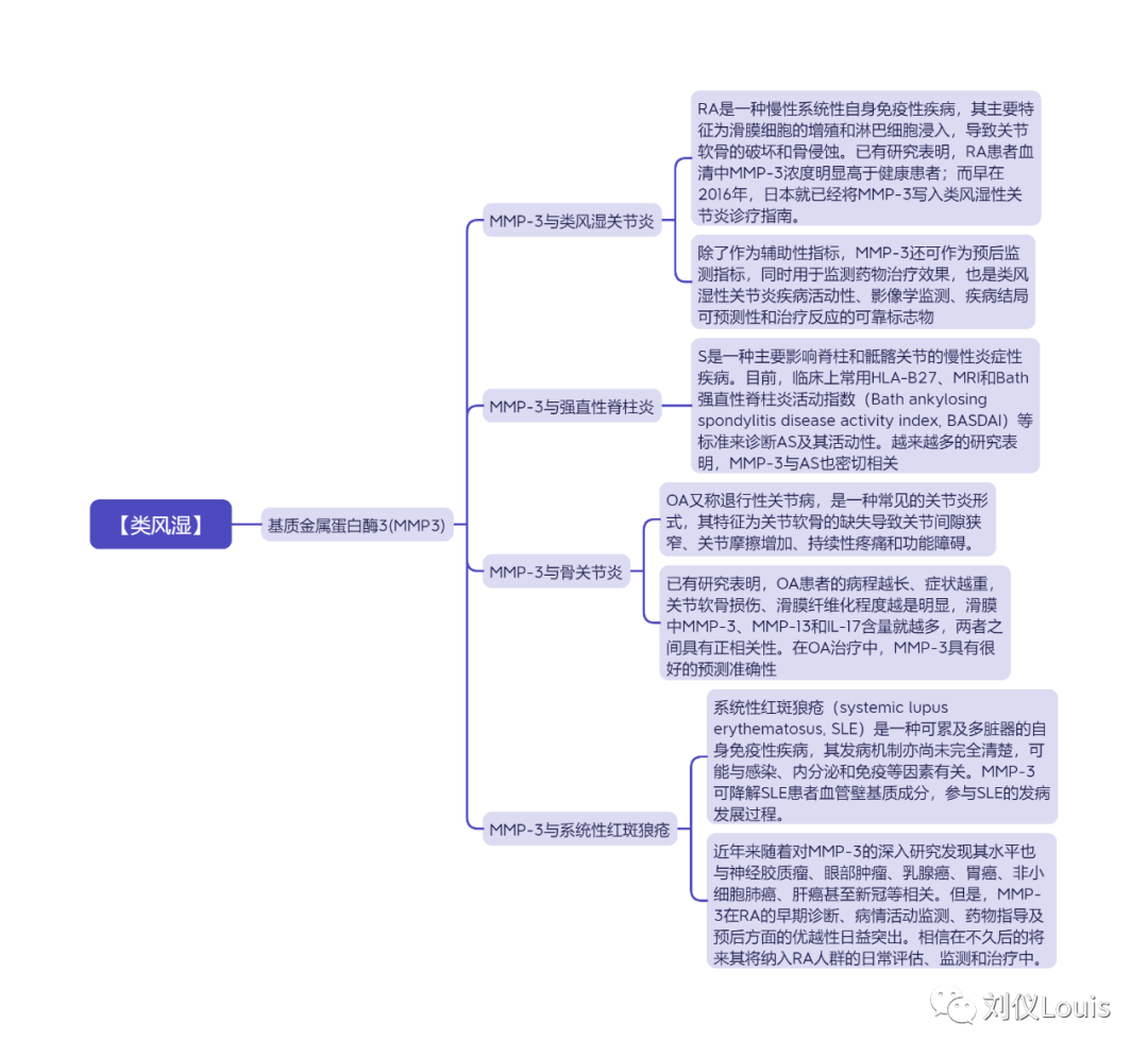 【类风湿】 基质金属蛋白酶3(MMP3) MMP-3与类风湿关节炎 RA是一种慢性系统性自身免疫性疾病,其主要特征为滑膜细胞的增殖和淋巴细胞浸入,导至关节软骨的破坏和骨侵蚀。已有研究表明,RA患者血清中MMP-3浓度明显高于健康患者;而早在2016年,日本就已经将MMP-3写入类风湿性关节炎诊疗指南。 除了作为辅助性指标,MMP-3还可作为预后监测指标,同时用于监测药物治疗效果,也是类风湿性关节炎疾病活动性、影像学监测、疾病结局可预测性和治疗反应的可靠标志物 MMP-3与强直性脊柱炎 S是一种主要影响脊柱和骶髂关节的慢性炎症性疾病。目前,临床上常用HLA-B27、MRI和Bath强直性脊柱炎活动指数(Bath ankylosing spondylitis disease activity index, BASDAI)等标准来诊断AS及其活动性。越来越多的研究表明,MMP-3与AS也密切相关 MMP-3与骨关节炎 OA又称退行性关节病,是一种常见的关节炎形式,其特征为关节软骨的缺失导至关节间隙狭窄、关节摩擦增加、持续性疼痛和功能障碍。 已有研究表明,OA患者的病程越长、症状越重,关节软骨损伤、滑膜纤维化程度越是明显,滑膜中MMP-3、MMP-13和IL-17含量就越多,两者之间具有正相关性。在OA治疗中,MMP-3具有很好的预测准确性 MMP-3与系统性红斑狼疮 系统性红斑狼疮(systemic lupus erythematosus, SLE)是一种可累及多脏器的自身免疫性疾病,其发病机制亦尚未完全清楚,可能与感染、内分泌和免疫等因素有关。MMP-3可降解SLE患者血管壁基质成分,参与SLE的发病发展过程。 近年来随着对MMP-3的深入研究发现其水平也与神经胶质瘤、眼部肿瘤、乳腺癌、胃癌、非小细胞肺癌、肝癌甚至新冠等相关。但是,MMP-3在RA的早期诊断、病情活动监测、药物指导及预后方面的优越性日益突出。相信在不久后的将来其将纳入RA人群的日常评估、监测和治疗中。