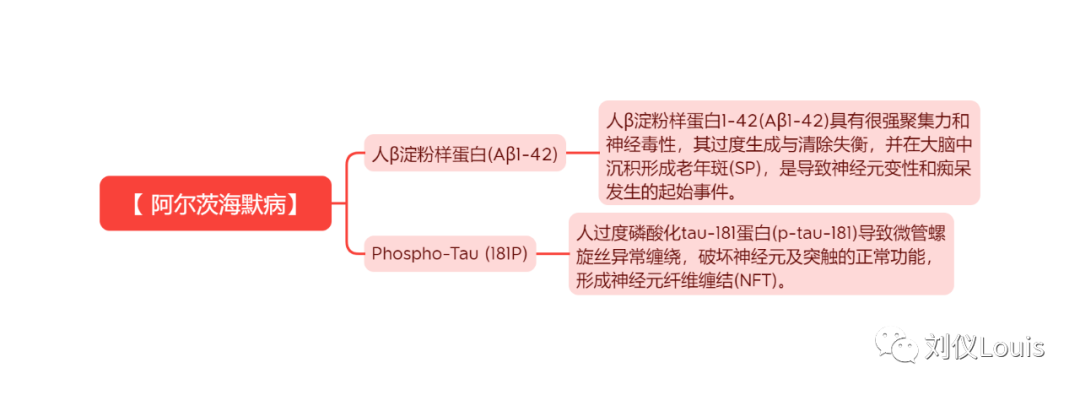 【 阿尔茨海默病】 人β淀粉样蛋白(Aβ1-42) 人β淀粉样蛋白1-42(Aβ1-42)具有很强聚集力和神经毒性,其过度生成与清除失衡,并在大脑中沉积形成老年斑(SP),是导至神经元变性和痴呆发生的起始事件。 Phospho-Tau (181P) 人过度磷酸化tau-181蛋白(p-tau-181)导至微管螺旋丝异常缠绕,破坏神经元及突触的正常功能,形成神经元纤维缠结(NFT)。