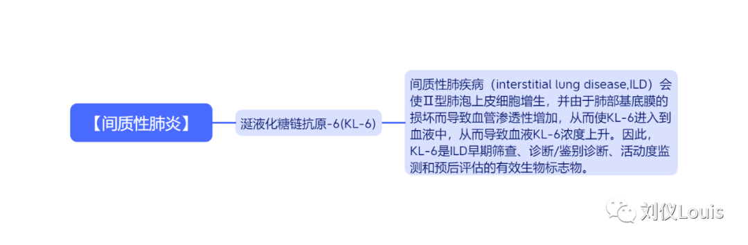 【间质性肺炎】 涎液化糖链抗原-6(KL-6) 间质性肺疾病(interstitial lung disease,ILD)会使Ⅱ型肺泡上皮细胞增生,并由于肺部基底膜的损坏而导至血管渗透性增加,从而使KL-6进入到血液中,从而导至血液KL-6浓度上升。因此,KL-6是ILD早期筛查、诊断/鉴别诊断、活动度监测和预后评估的有效生物标志物。