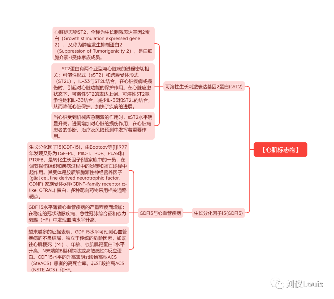 【心肌标志物】 可溶性生长刺激表达基因2蛋白(sST2) 心脏标志物ST2,全称为生长刺激表达基因2蛋白(Growth stimulation expressed gene 2), 又称为肿瘤发生抑制蛋白2(Suppression of Tumorigenicity 2),是白细胞介素-1受体家族成员。 ST2蛋白有两个亚型与心脏病的进程密切相关:可溶性形式(sST2)和跨膜受体形式(ST2L)。IL-33与ST2L结合,在心脏疾病或损伤时,引起对心脏功能的保护作用。在心脏应激状态下,可溶性ST2的表达上调。可溶性ST2竞争性地和IL-33结合,减少IL-33和ST2L的结合,从而降低心脏保护,加快了疾病的进展。 当心脏受到机械应急刺激的作用时,sST2水平明显升高,进而增加对心脏的损伤作用,在心脏病患者的诊断、治疗及风险预测中发挥着重要作用。 生长分化因子15(GDF15) GDF15与心血管疾病 生长分化因子15(GDF-15),由Bootcov等[1]1997年发现又称为TGF-PL、MIC-1、PDF、PLAB和PTGFB,是转化生长因子β超家族中的一员,在调节损伤组织和疾病过程中的炎症和凋亡途径中起作用。其受体是胶质细胞源性神经营养因子(glial cell line derived neurotrophic factor, GDNF) 家族受体α样(GDNF-family receptor α-like, GFRAL) 蛋白,多种靶向药物采用相关通路靶点。 GDF 15水平随着心血管疾病的严重程度而增加:在稳定的冠状动脉疾病、急性冠脉综合征和心力衰竭(HF)中发现血清水平升高。 越来越多的证据表明,GDF 15水平可预测心血管疾病的不良结局,独立于传统的危险因素,如既往心肌梗死(MI)、年龄、心肌肌钙蛋白T水平升高、N末端前B型利钠肽或高敏感性C反应蛋白。GDF 15水平的升高表明st段抬高型ACS(SteACS)患者的高死亡率,非ST段抬高ACS(NSTE ACS)和HF。