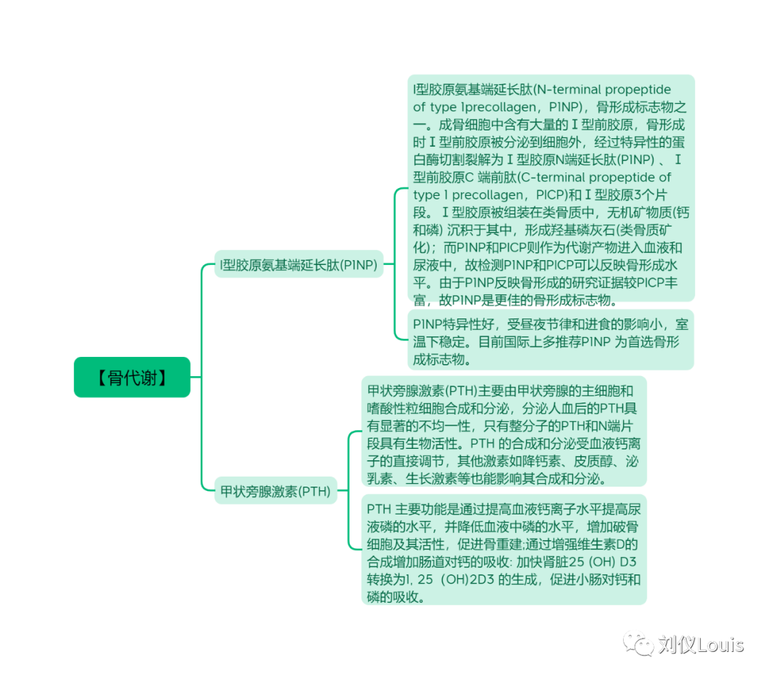 【骨代谢】 I型胶原氨基端延长肽(P1NP) I型胶原氨基端延长肽(N-terminal propeptide of type 1precollagen,P1NP),骨形成标志物之一。成骨细胞中含有大量的Ⅰ型前胶原,骨形成时Ⅰ型前胶原被分泌到细胞外,经过特异性的蛋白酶切割裂解为Ⅰ型胶原N端延长肽(P1NP) 、Ⅰ型前胶原C 端前肽(C-terminal propeptide of type 1 precollagen,PICP)和Ⅰ型胶原3个片段。Ⅰ型胶原被组装在类骨质中,无机矿物质(钙和磷) 沉积于其中,形成羟基磷灰石(类骨质矿化);而P1NP和PICP则作为代谢产物进入血液和尿液中,故检测P1NP和PICP可以反映骨形成水平。由于P1NP反映骨形成的研究证据较PICP丰富,故P1NP是更佳的骨形成标志物。 P1NP特异性好,受昼夜节律和进食的影响小,室温下稳定。目前国际上多推荐P1NP 为首选骨形成标志物。 甲状旁腺激素(PTH) 甲状旁腺激素(PTH)主要由甲状旁腺的主细胞和嗜酸性粒细胞合成和分泌,分泌人血后的PTH具有显著的不均一性,只有整分子的PTH和N端片段具有生物活性。PTH 的合成和分泌受血液钙离子的直接调节,其他激素如降钙素、皮质醇、泌乳素、生长激素等也能影响其合成和分泌。 PTH 主要功能是通过提高血液钙离子水平提高尿液磷的水平,并降低血液中磷的水平,增加破骨细胞及其活性,促进骨重建;通过增强维生素D的合成增加肠道对钙的吸收: 加快肾脏25 (OH) D3转换为1, 25(OH)2D3 的生成,促进小肠对钙和磷的吸收。