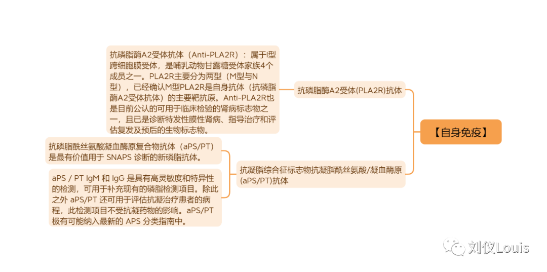 【自身免疫】 抗磷脂酶A2受体(PLA2R)抗体 抗磷脂酶A2受体抗体(Anti-PLA2R):属于I型跨细胞膜受体,是哺乳动物甘露糖受体家族4个成员之一。PLA2R主要分为两型(M型与N型),已经确认M型PLA2R是自身抗体(抗磷脂酶A2受体抗体)的主要靶抗原。Anti-PLA2R也是目前公认的可用于临床检验的肾病标志物之一,且已是诊断特发性膜性肾病、指导治疗和评估复发及预后的生物标志物。 抗凝脂综合征标志物抗凝脂酰丝氨酸/凝血酶原(aPS/PT)抗体 抗磷脂酰丝氨酸凝血酶原复合物抗体(aPS/PT)是最有价值用于 SNAPS 诊断的新磷脂抗体。 aPS / PT IgM 和 IgG 是具有高灵敏度和特异性的检测,可用于补充现有的磷脂检测项目。除此之外 aPS/PT 还可用于评估抗凝治疗患者的病程,此检测项目不受抗凝药物的影响。aPS/PT 极有可能纳入最新的 APS 分类指南中。