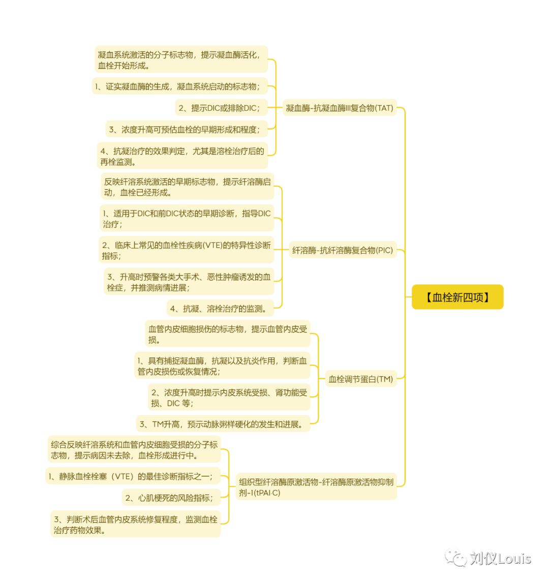 【血栓新四项】 凝血酶-抗凝血酶III复合物(TAT) 凝血系统激活的分子标志物,提示凝血酶活化,血栓开始形成。 1、证实凝血酶的生成,凝血系统启动的标志物; 2、提示DIC或排除DIC; 3、浓度升高可预估血栓的早期形成和程度; 4、抗凝治疗的效果判定,尤其是溶栓治疗后的再栓监测。 纤溶酶-抗纤溶酶复合物(PIC) 反映纤溶系统激活的早期标志物,提示纤溶酶启动,血栓已经形成。 1、适用于DIC和前DIC状态的早期诊断,指导DIC治疗; 2、临床上常见的血栓性疾病(VTE)的特异性诊断指标; 3、升高时预警各类大手术、恶性肿瘤诱发的血栓症,并推测病情进展; 4、抗凝、溶栓治疗的监测。 血栓调节蛋白(TM) 血管内皮细胞损伤的标志物,提示血管内皮受损。 1、具有捕捉凝血酶,抗凝以及抗炎作用,判断血管内皮损伤或恢复情况; 2、浓度升高时提示内皮系统受损、肾功能受损、DIC 等; 3、TM升高,预示动脉粥样硬化的发生和进展。 组织型纤溶酶原激活物-纤溶酶原激活物抑制剂-1(tPAI·C) 综合反映纤溶系统和血管内皮细胞受损的分子标志物,提示病因未去除,血栓形成进行中。 1、静脉血栓栓塞(VTE)的最佳诊断指标之一; 2、心肌梗死的风险指标; 3、判断术后血管内皮系统修复程度,监测血栓治疗药物效果。