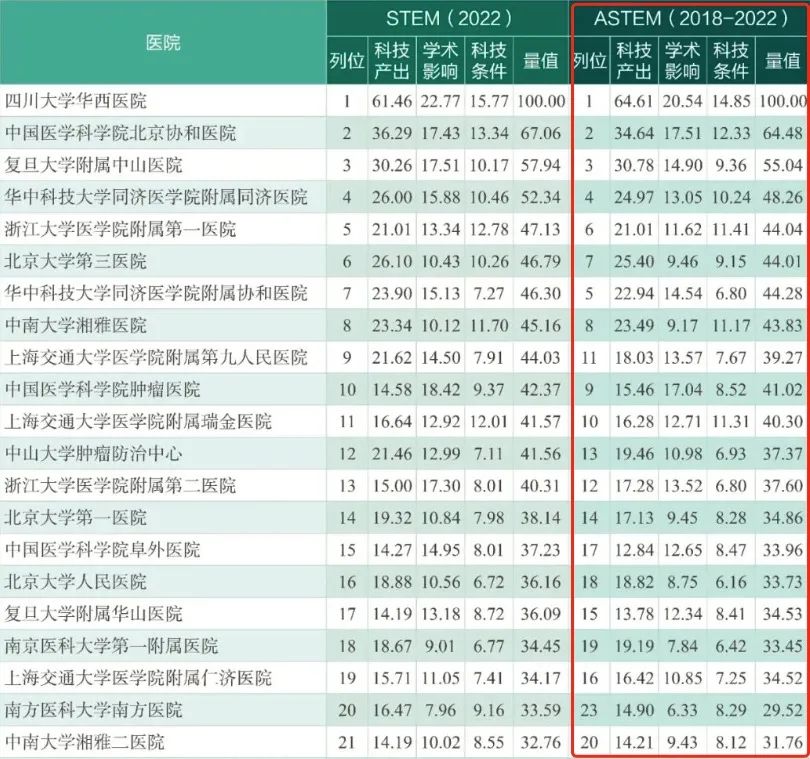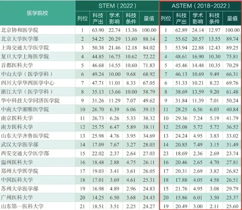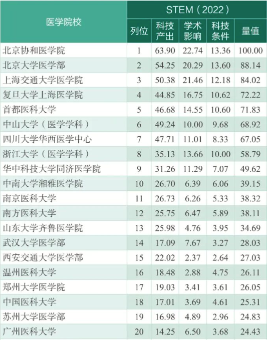 昨天,中国医学科学院协和医学院在协和壹号礼堂发布了最新的中国医学院校/中国医院科技量值(STEM)。中国医学科学院于 2018 年首次创立科技量值(Science and Technology Evaluation Metrics, STEM)概念,今年已经是第六年,由医院评价、学科评价拓展至院校、人才、团队、平台、项目评价。2022 年度中国医学院校科技量值研究对象覆盖全国 110 所独立医学院校和设立医学学科的综合大学;2022 年度中国医院科技量值研究对象覆盖全国 1,644 家三级医院。同时,今年还发布了 2018~2022 五年总科技量值报告。2022 年度中国医学院校科技量值(STEM)排名中,北京协和医学院蝉联第一,科技量值和 2021 年度一样为 100;北京大学医学部尽管保持第二,但 2022 年的量值仅为 88.14 (2021 年 92.69)。第一名和第十名的总量值相差近 60。2022 年度中国医学院校科技量值(前 20 位) 在 2022 年度中国医院科技量值(STEM)中,四川大学华西医院在综合评价中断层第一,科技产出、学术影响、科技条件三个维度都大幅领先第二名。2022 年度中国医院科技量值(综合)(前 20 位) 在分学科排名中,华西医院在麻醉学、泌尿外科学、骨外科学、危重症医学、急诊医学、护理学中均位列第一。在 31 个学科科技量值中,华西医院有 25 个学科位列前十,在所有纳入评价的医院中是最多的。和 2022 年度榜单一起发布的,还有 2018~2022 年五年总科技量值(ASTEM),相比年度榜单,ASTEM 能够显示机构稳定、持久的科技水平。总科技量值于去年首次发布,它并非往年累积科技量值的平均值,而是基于新的指标体系进行过去若干年度(一般为过去五年)数据的重新测算。